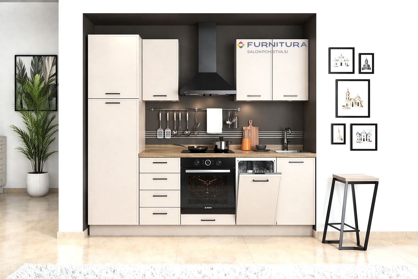 Uključena je i radna ploča duljine 195 cm, cokl duljine 255 cm, 12 ručkica, dvije završne bočne obloge cokla te brtvena letvica sa završecima.