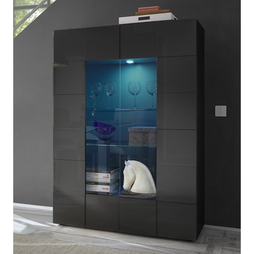Ova prostrana vitrina s dvostrukim staklenim vratima omogućuje elegantno izlaganje ukrasa, kristala ili srebrnog posuđa u dnevnom boravku. Proizvedena je u Italiji od visokokvalitetnih materijala, što jamči dugotrajnost i čvrstoću. Sjajna antracitna završna obrada unosi sofisticiranost i lako se uklapa u svaki stil namještaja.
