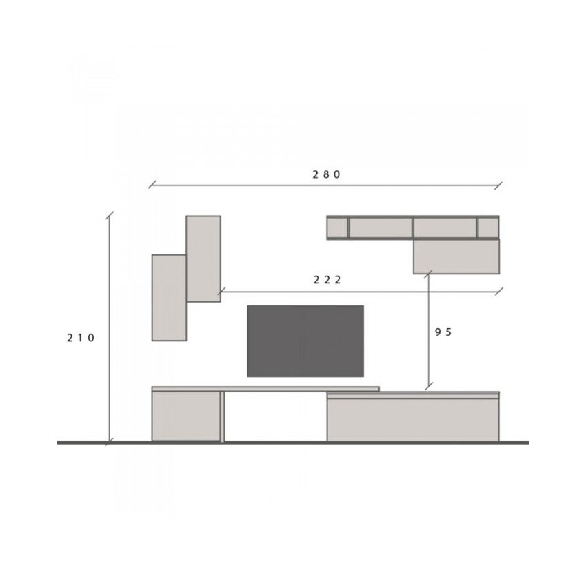 Set uključuje TV ormarić s preklopnim vratima, tri viseća ormarića s vratima i policu s pretincima. Modularni sastav omogućuje prilagodbu vašim prostornim potrebama i organizacijskim željama.
