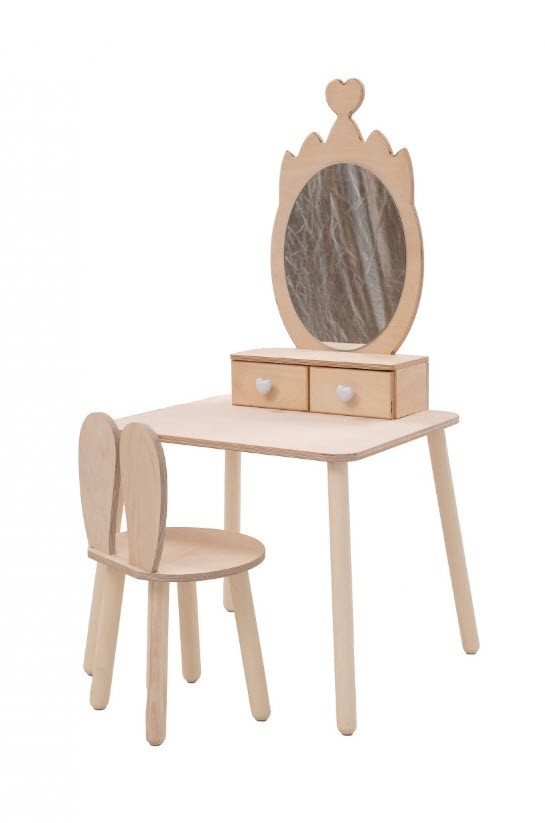 Montessori kozmetički stol Krona donijet će dašak elegancije i glamura u dječju sobu. Osmišljen je na način koji potiče kreativnost i maštu, te omogućuje čarobnu i nezaboravnu igru. Komplet uključuje stolić, stolicu, ogledalo i dvije ladice u koje vaše dijete može pohraniti razne dodatke i igračke. Dostupan je u natur, bijelioj, sivoj i roza boji, a ima snažnu konstrukciju koja će vašem djetetu omogućiti sigurno i neometano uživanje u igri.