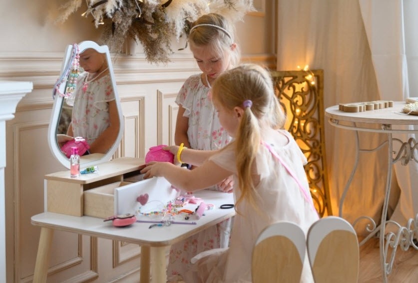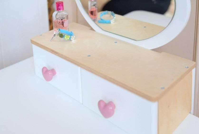 Šarmantni kozmetički stol Tulipan dizajniran je na način koji potiče kreativnost i maštu te omogućuje čarobnu i nezaboravnu igru. Dodat će dašak elegancije i glamura dječjoj sobi. Dostupan je u četiri moderne boje i ima jaku konstrukciju koja osigurava sigurno i neometano uživanje u maštovitoj igri. Komplet uključuje stol, stolicu, ogledalo i dvije ladice u koje dijete može pohraniti svoj nakit, igračke i razne dodatke.