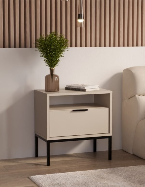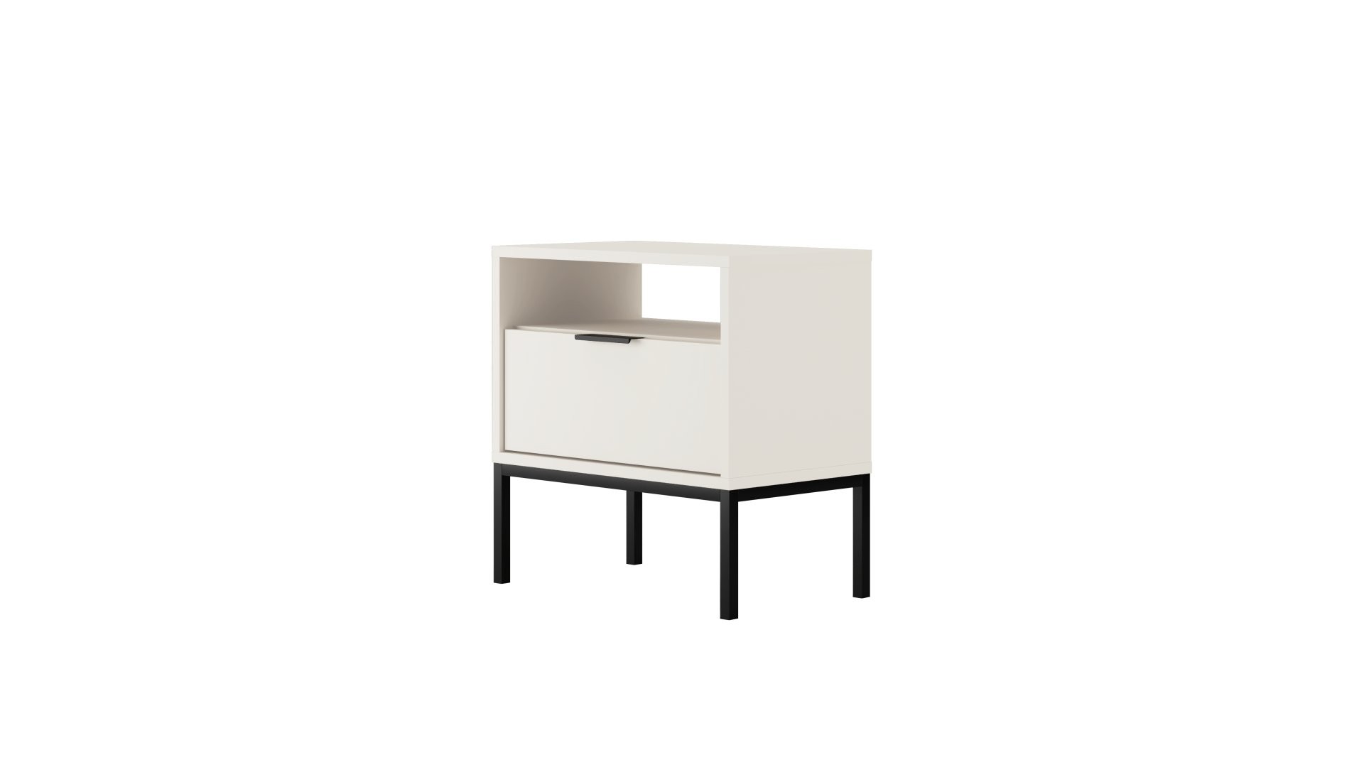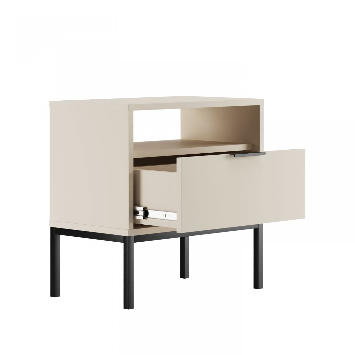Model uključuje otvorenu policu za predmete koje želite imati pri ruci te prostranu ladicu za pohranu sitnica. Cjelinu nadopunjuju aluminijska ručkica i postolje od praškasto bojanog čelika koji naglašavaju suvremen karakter ormarića. Ladica ima puni izvlačaj na sinkroniziranim vodilicama, a rubovi su zaštićeni ABS oblogom. Ormarić je dostupan u više boja i namijenjen samostalnoj montaži.