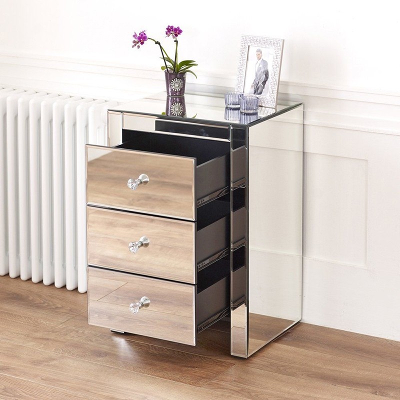 Stekleno nočno omarico DUCCHES GLAM lahko uporabite kot nočno omarico ali pa kot predalnik v katerem drugem prostoru vašega doma. Ima tri predale, v katere lahko pospravite knjige, revije, polnilec za telefon in ostale malenkosti, katere vedno želite imeti pri roki. Predali imajo funkcijo tihega zapiranja, ki vam nudi lažjo uporabo in preprečuje trenje ter nastajanje prask in poškodb.