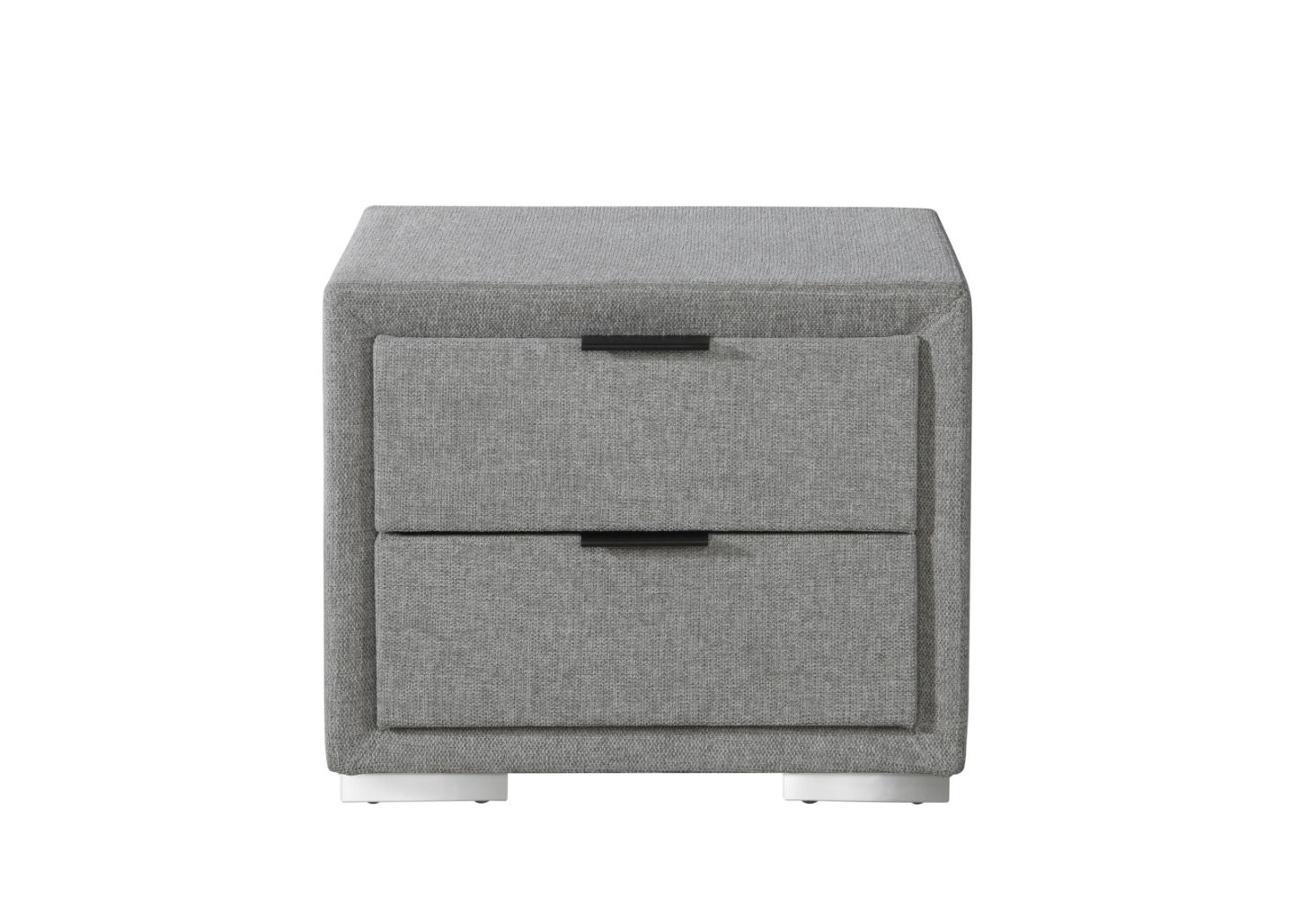 Noćni ormarić Gern u modernom i skandinavskom stilu sa sivim presvlakama. Praktičan i elegantan, savršeno nadopunjuje različite spavaće garniture i stilove interijera.