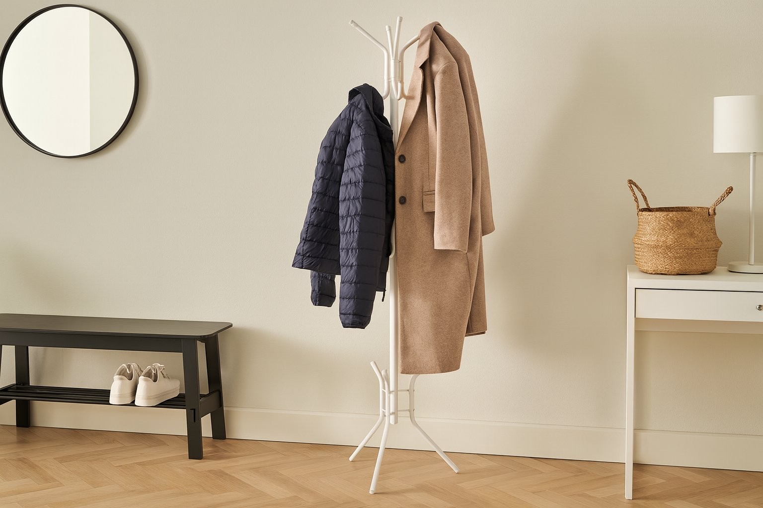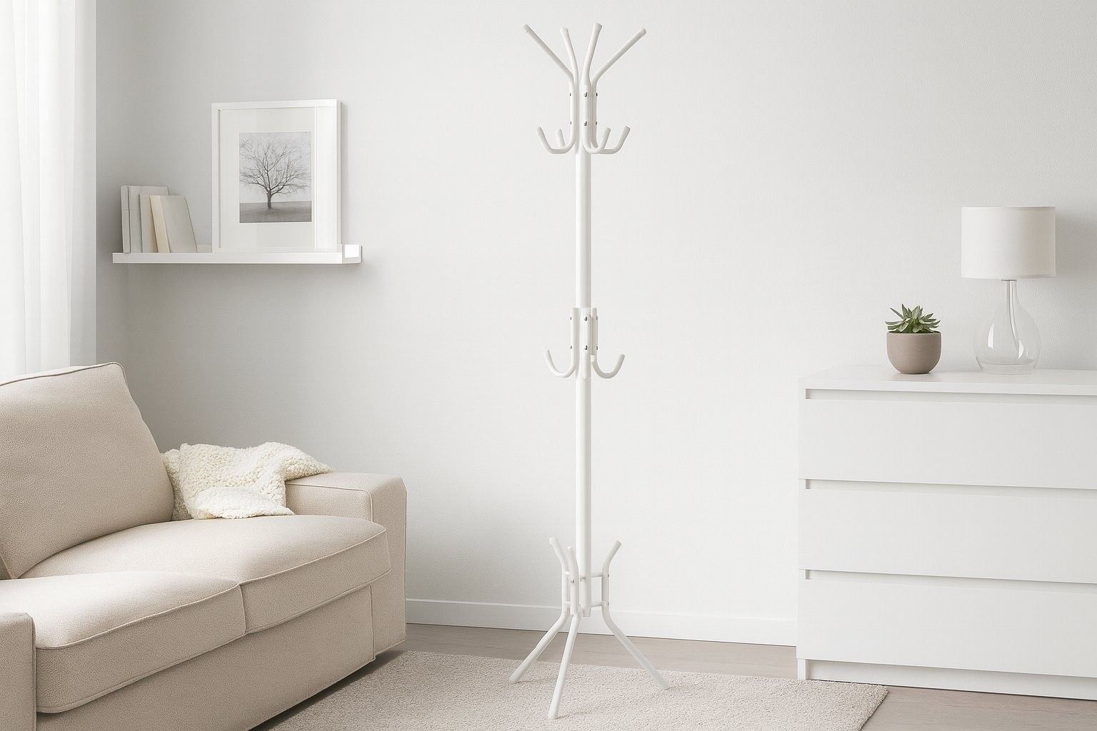 Vješalica Cunen (bijela) je funkcionalan komad namještaja odnosno dodatak za dom koji spaja praktičnost i uredan izgled. Boja u nijansi bijela lako se uklapa u različite ambijente. Odabir materijala poput metala upotpunjuje funkcionalnu i vizualno uravnoteženu izvedbu.