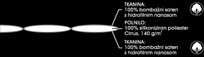 Polnino: 100% poliester Cirrus, 170 g/m2. Kvalitetna poliestrna vlakna imajo izjemno sposobnost regulacije vlage in toplote ter s tem ustvarjajo optimalno mikroklimo med spanjem. V primerjavi z ostalimi poliestrnimi vlakni so Cirrus vlakna bolj zračna.