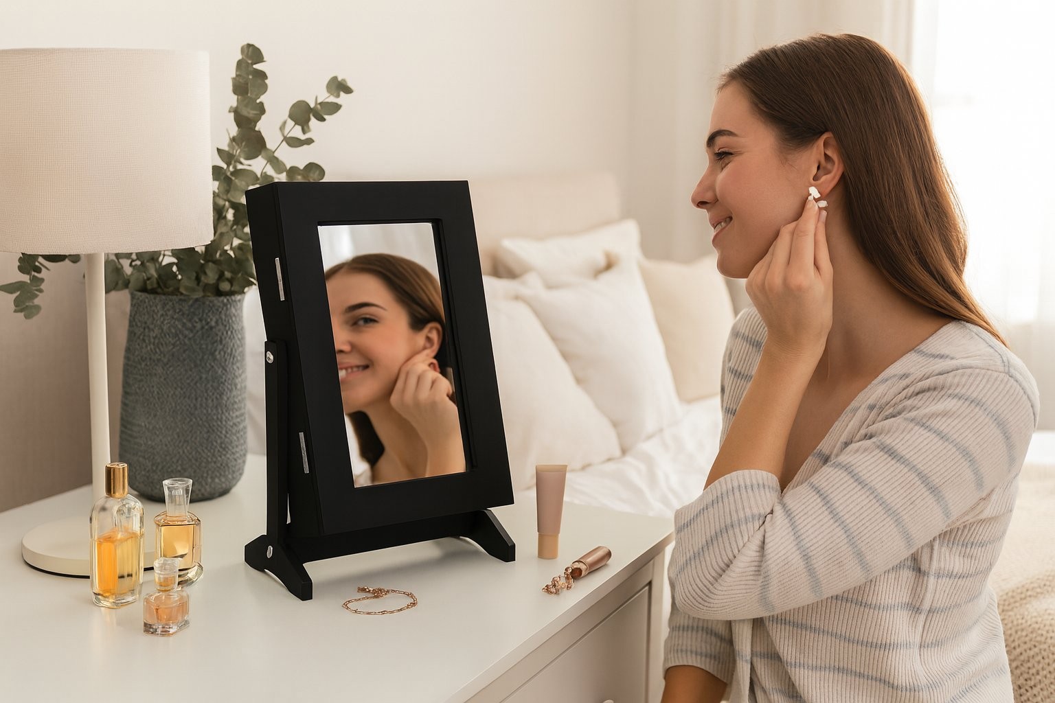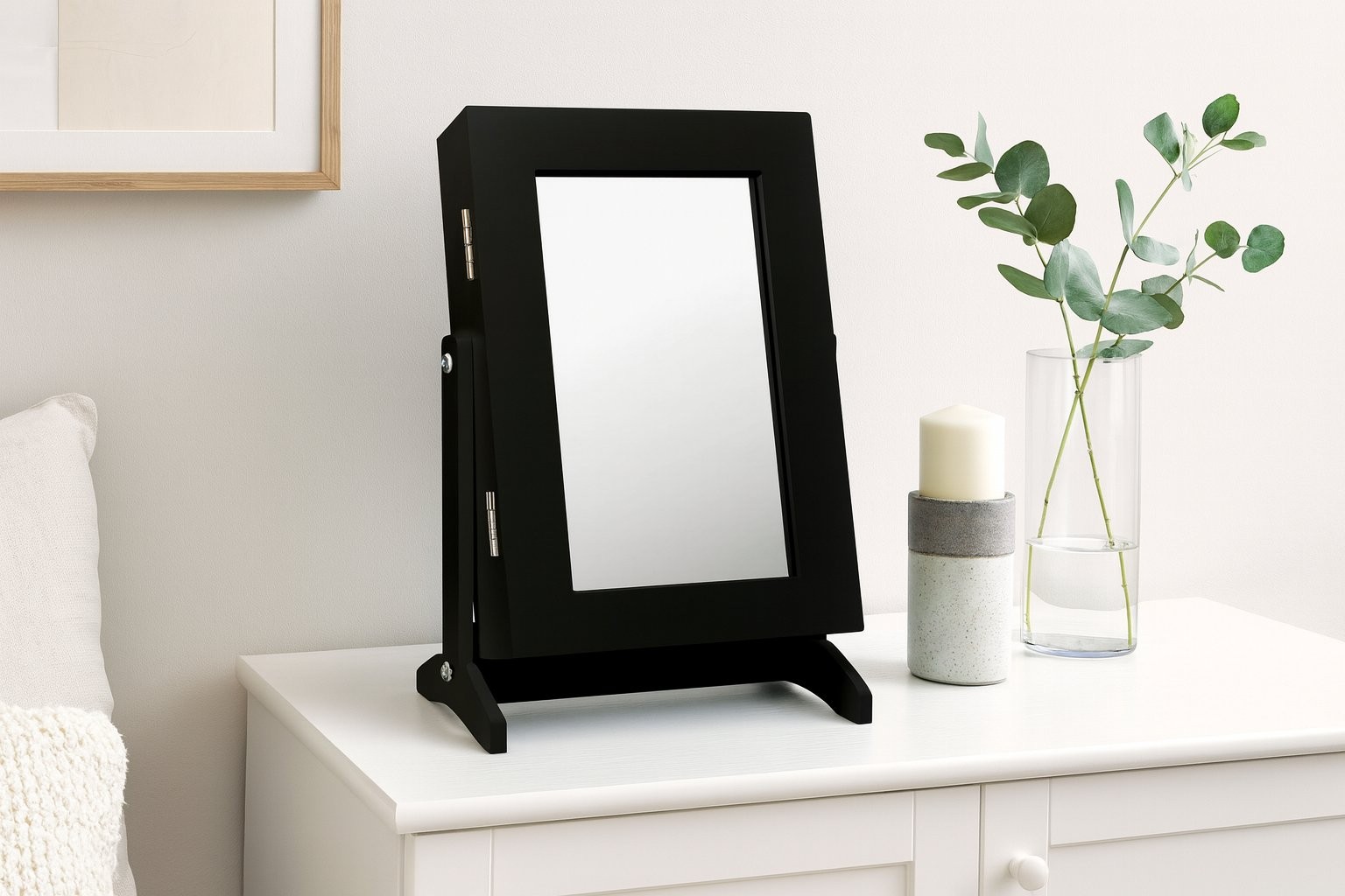 Omarica za nakit Ramar s ogledalom (crna) je kompaktna rešitev za pregledno shranjevanje. Crna boja djeluje elegantno i lijepo se uklapa u različite ambijente.
