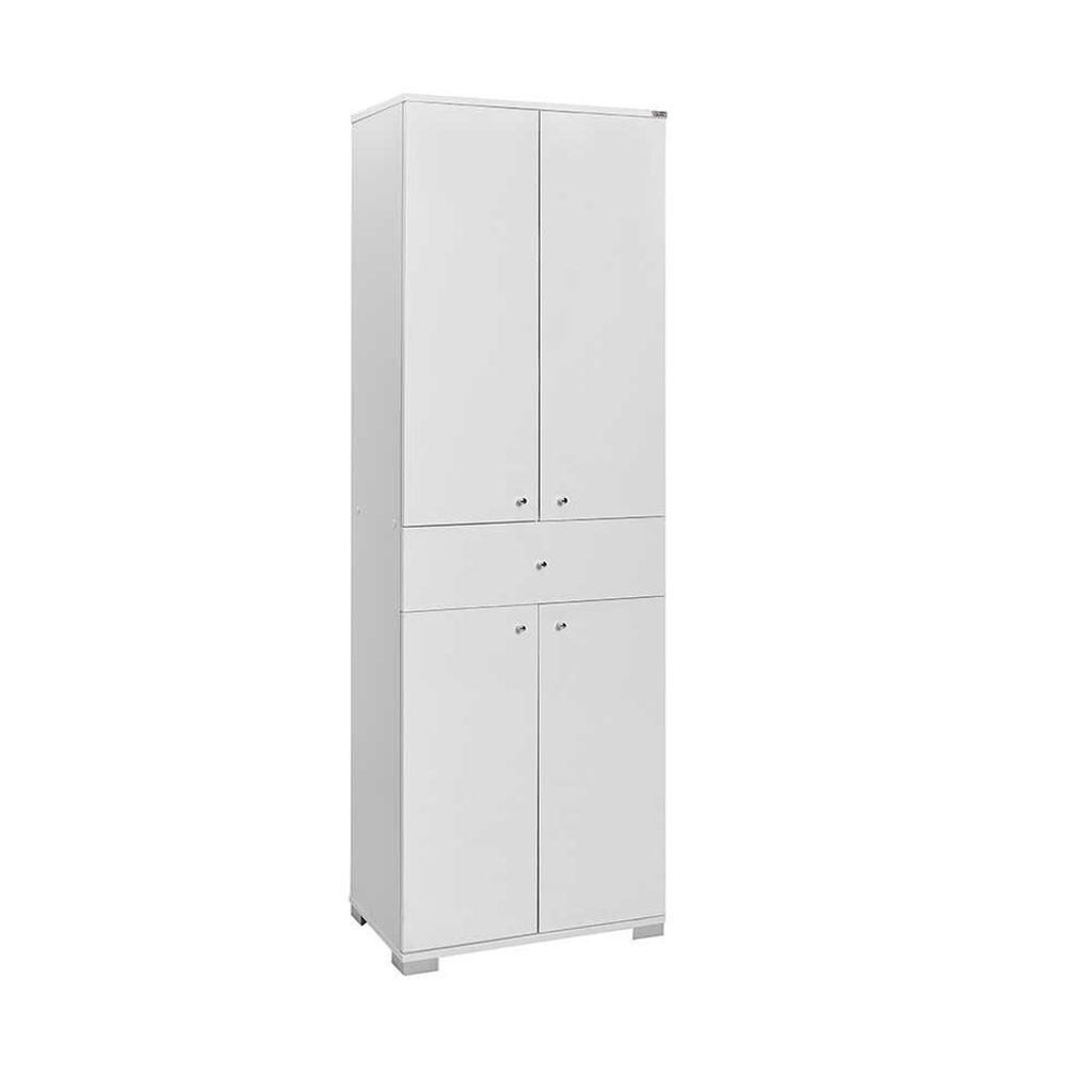 Sadrži dva dijela s policama i jednu prikladnu ladicu u sredini. Sve ručke su metalne.