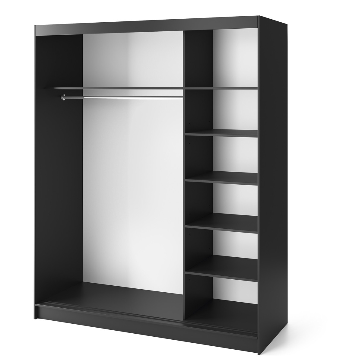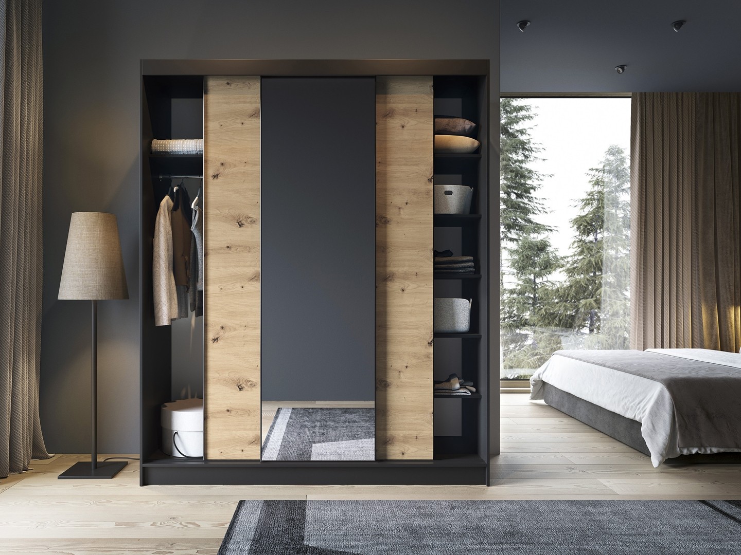 Priuštite si moderan i visokokvalitetan ESVILLE ormar s kliznim vratima od 180 cm, koji je dostupan u kombinaciji hrasta i mat crne boje. Ovaj ormar donijet će svježinu u vašu spavaću sobu i vizualno povećati prostor uz pomoć ugrađenog ogledala. Unutra dolazi s dugom šipkom za vješanje i šest polica na kojima možete organizirati svoje majice, trenirke, rukavice, šešire i donje rublje.