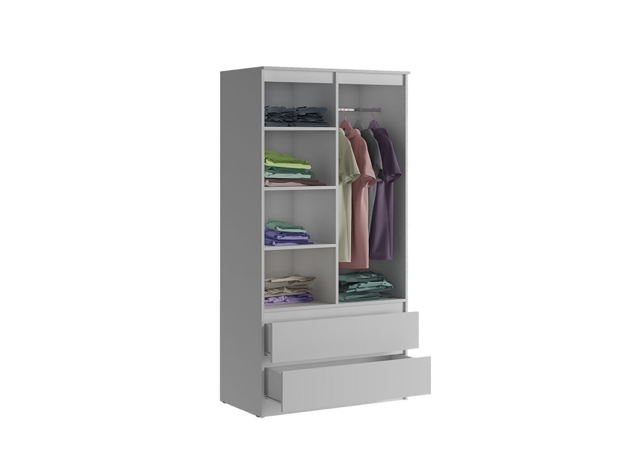 Moderan i minimalistički ormar MAIDA uljepšat će svaku prostoriju i učiniti je funkcionalnijom. Zahvaljujući modernoj bijeloj boji u visokom sjaju, ormar se odlično slaže sa svim ostalim komadima vašeg namještaja. Odlikuje se klasičnim dizajnom i dosta prostora za pohranu, jer sadrži 2 široke ladice, tri manje police i prikladnu šipku za vješanje.