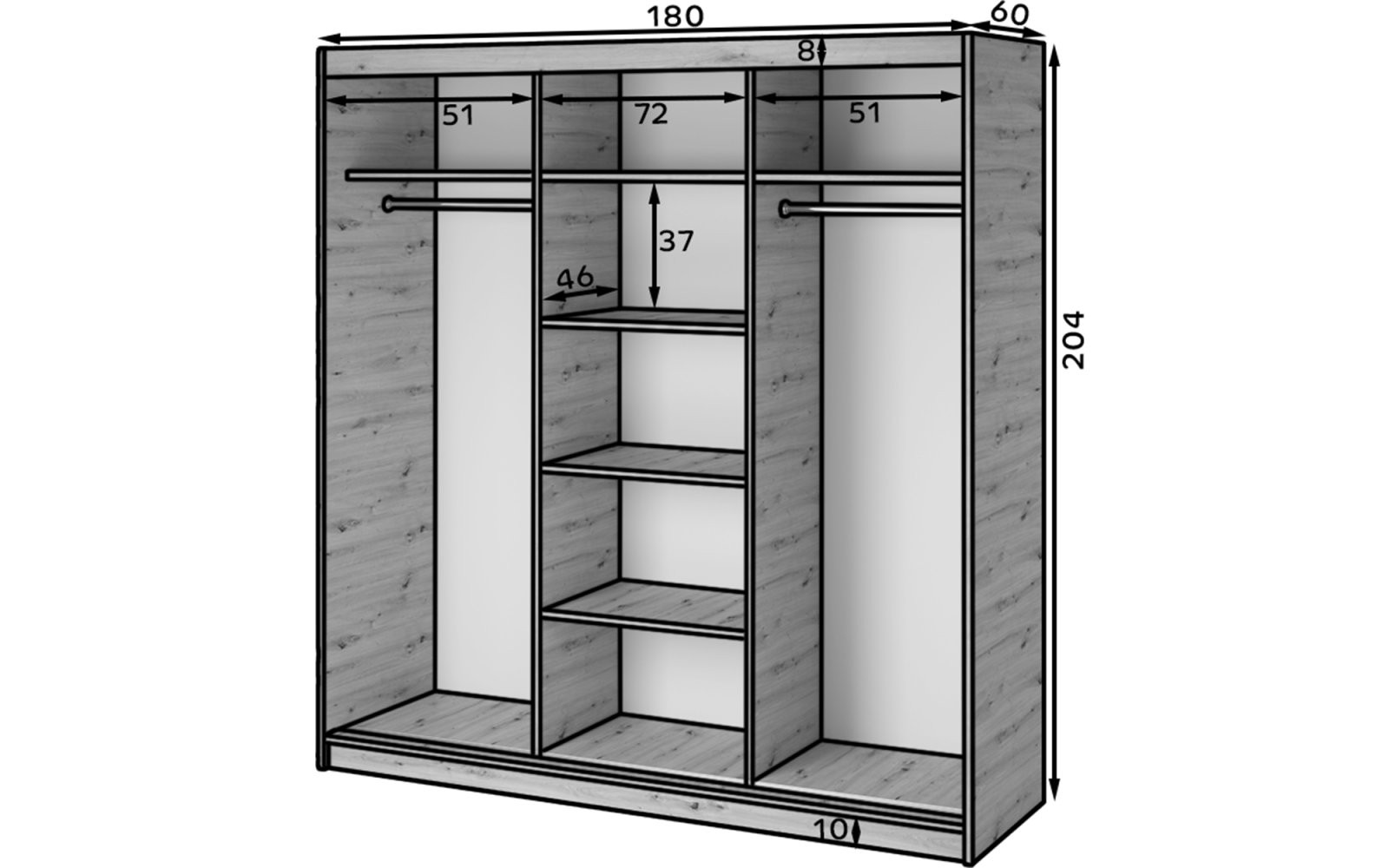Ormar s kliznim vratima Emerio III, dimenzija 180x204x60 cm, moderan je i funkcionalan izbor za spavaću sobu, garderobu ili predsoblje. Ovaj ormar kombinira estetiku, trajnost i praktičnost, te je idealno rješenje za suvremeno opremljene prostore gdje je prostor dragocjen.