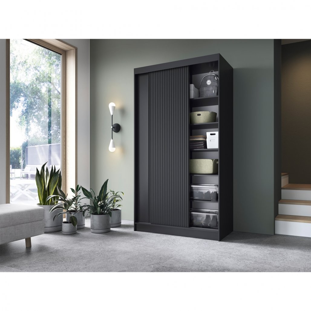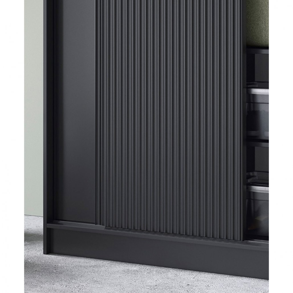 Korpus ormara izrađen je od izdržljive i robusne MDF ploče debljine 16 mm, što osigurava stabilnost i čvrstoću konstrukcije. ABS rub na rubovima pruža dodatnu zaštitu od mogućih oštećenja, produžujući vijek trajanja ormara. Crna boja ormara daje mu moderan karakter koji se savršeno uklapa u različite stilove uređenja interijera.