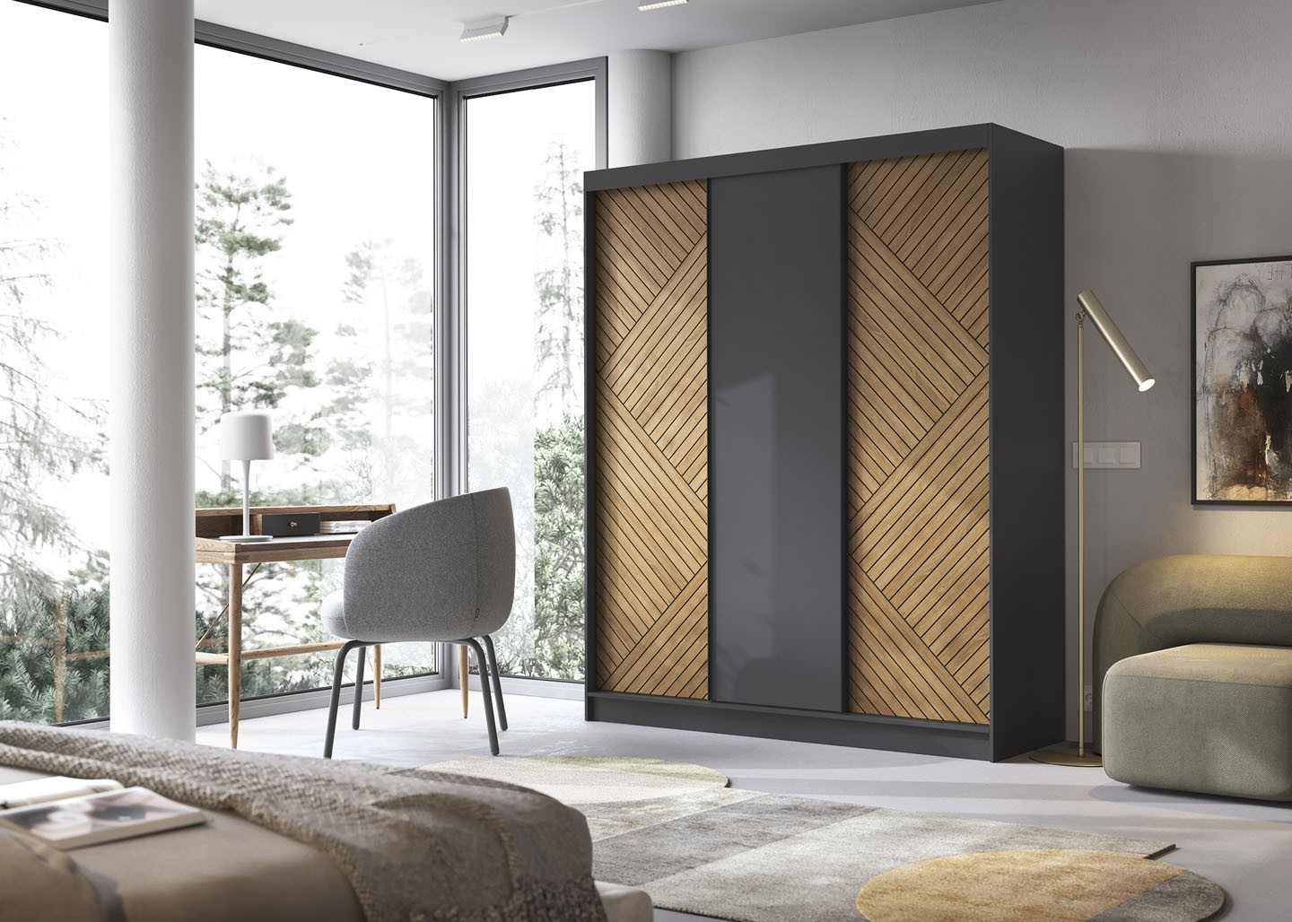 Počastite se ormarom s kliznim vratima MARPHY - 180 cm, koji je ukrašen prekrasnim uzorcima koji stvaraju moderan izgled. Ormar ima dovoljno prostora za odlaganje majica i džempera i dugu viseću šipku koja vam omogućuje da objesite bolju odjeću. Dostupan je u kombinaciji karamelnog hrasta i crne boje kako bi oživio vaš prostor za spavanje.