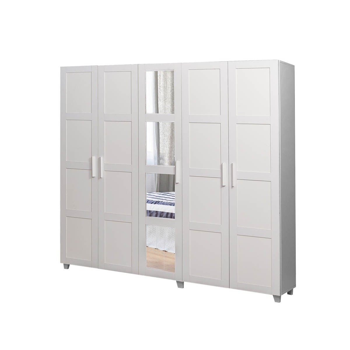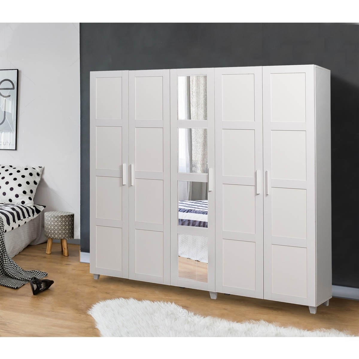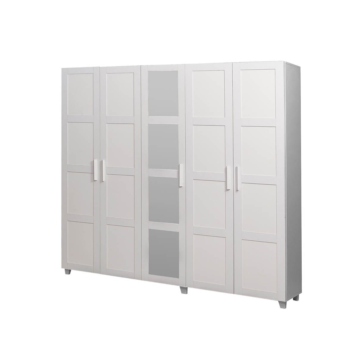 Moderni ormar VICTORIA sastoji se od tri dijela, koji su dostupni u čistoj bijeloj boji. Srednji dio ormara sadrži ogledalo, koje je podijeljeno na četiri dijela, što će dodati vizualnu prostranost u vašu sobu i omogućiti vam da se uredite prije odlaska iz kuće. Oba bočna ormara sadrže puno prostora za vješanje odjeće i police za pohranu osobnih predmeta.