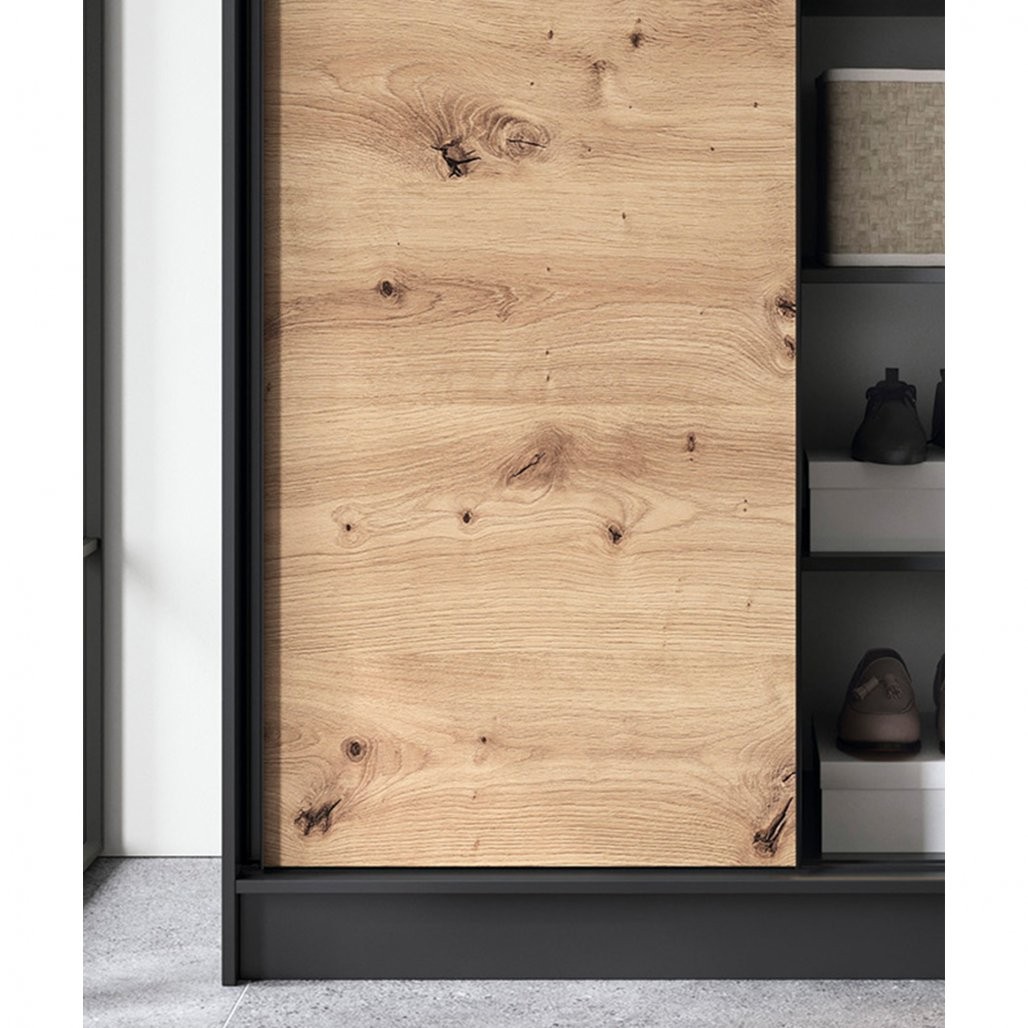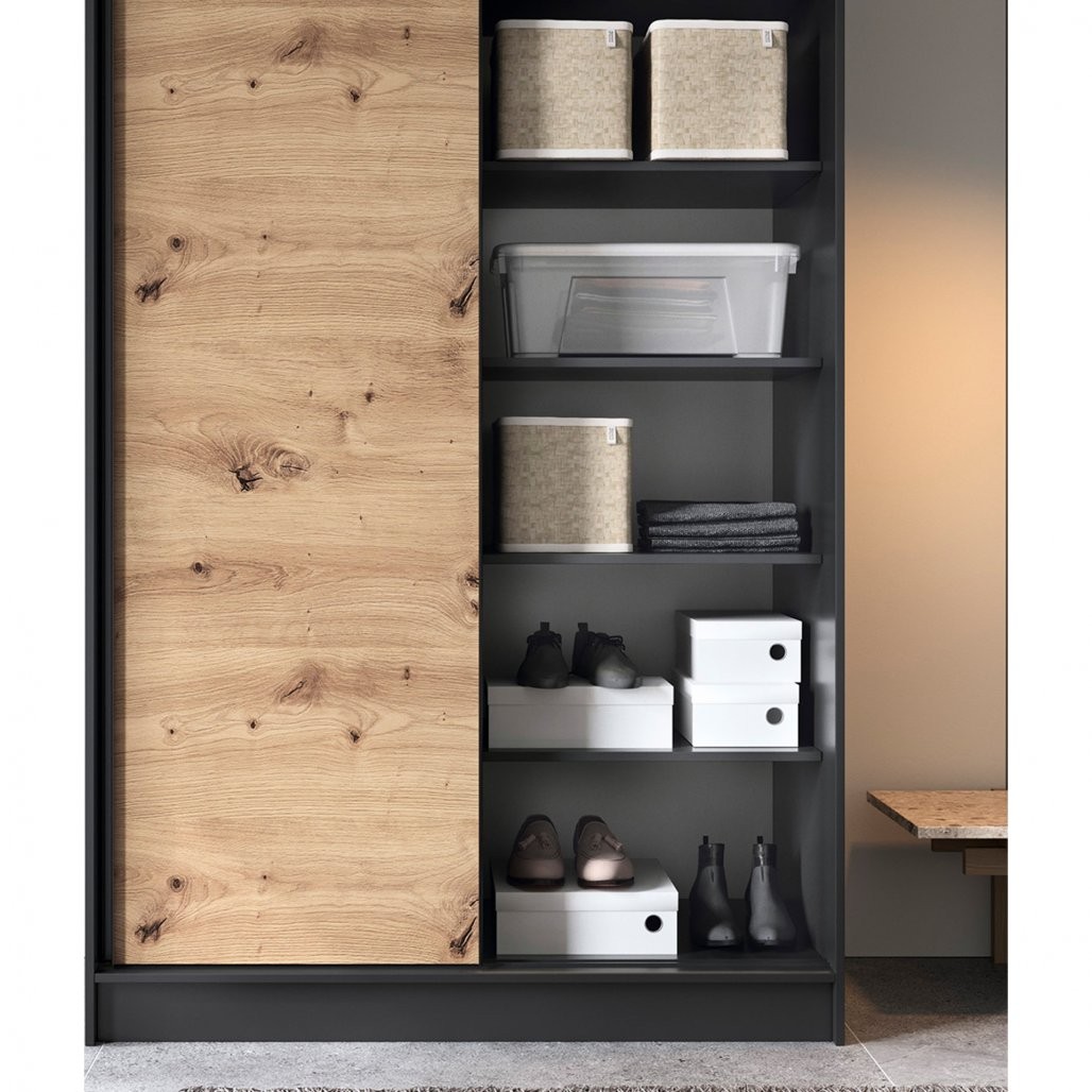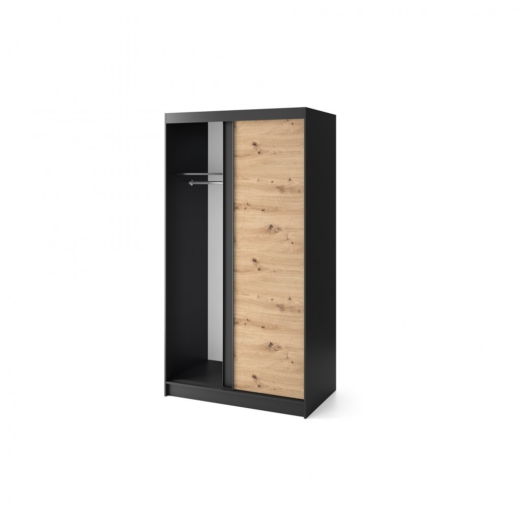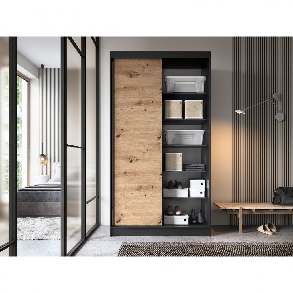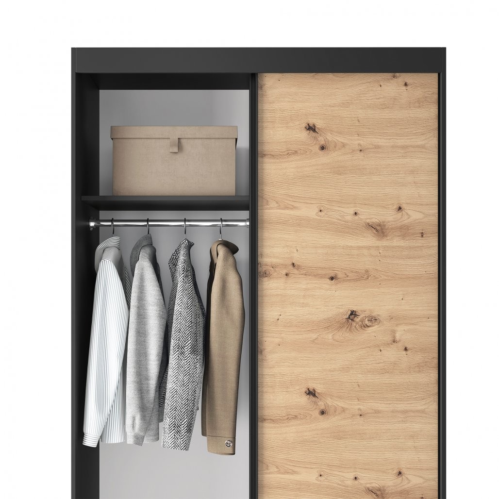 Dvoja klizna vrata omogućuju praktično otvaranje i zatvaranje ormara bez zauzimanja dodatnog prostora u sobi, što vam omogućuje da ormar slobodno postavite i u manju sobu. Kombinacija boja u nijansama hrasta Artisan i mat crne daje mu moderan i elegantan karakter koji se dobro uklapa u različite stilove uređenja interijera. Treba istaknuti i nogice visine 0,5 cm, izrađene od izdržljive plastike, koje olakšavaju premještanje namještaja i osiguravaju stabilnost.