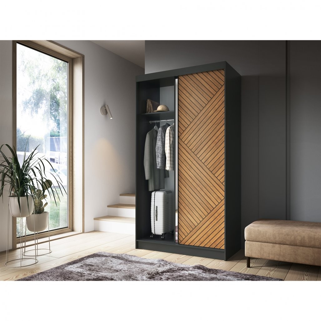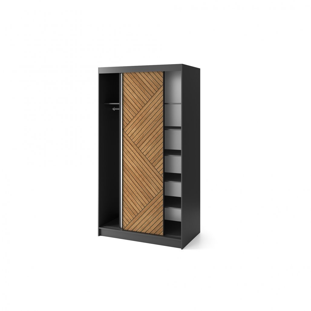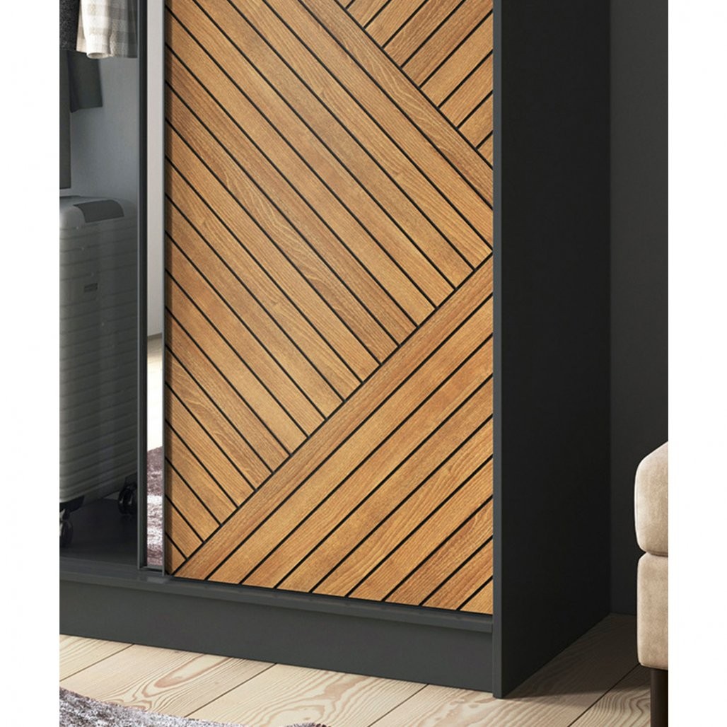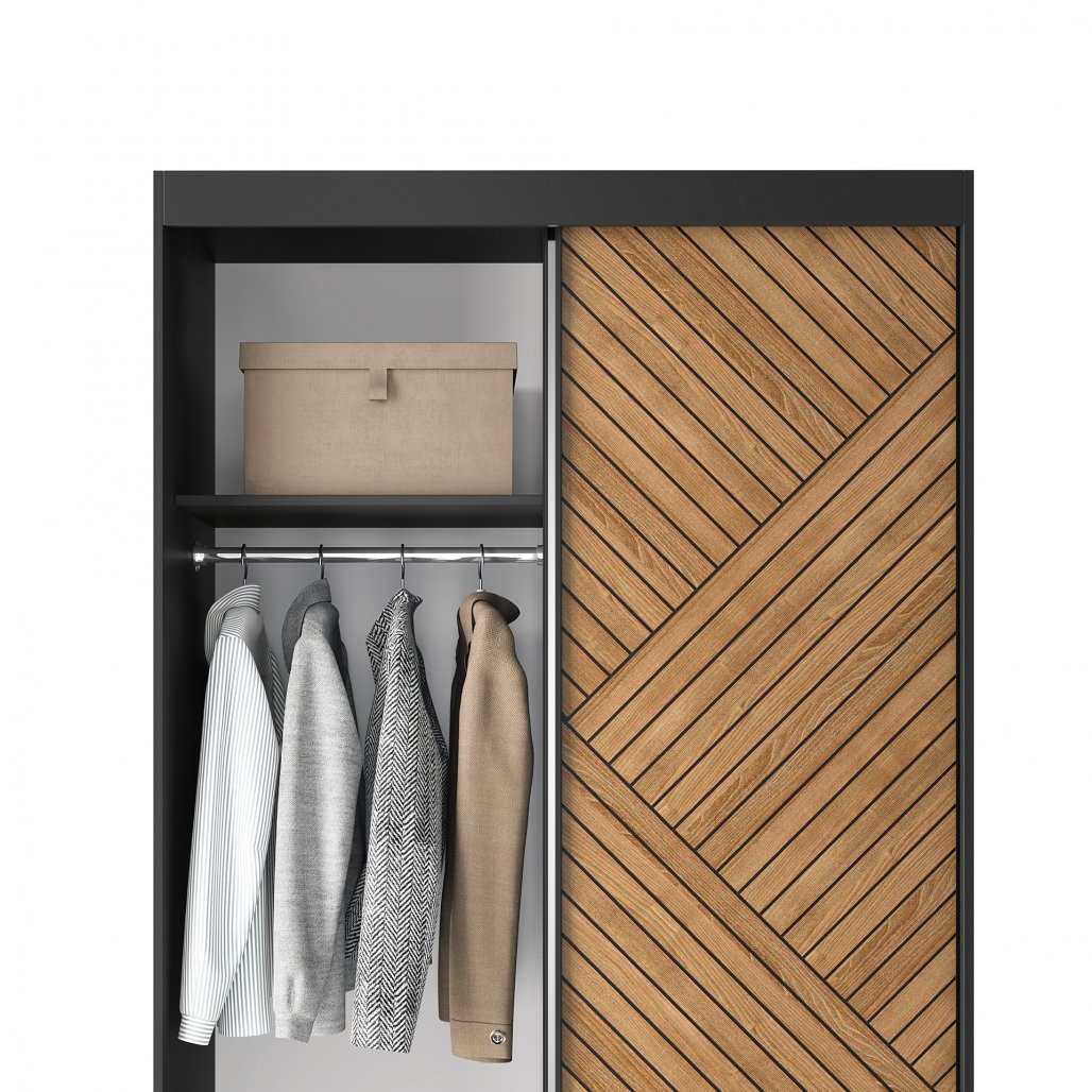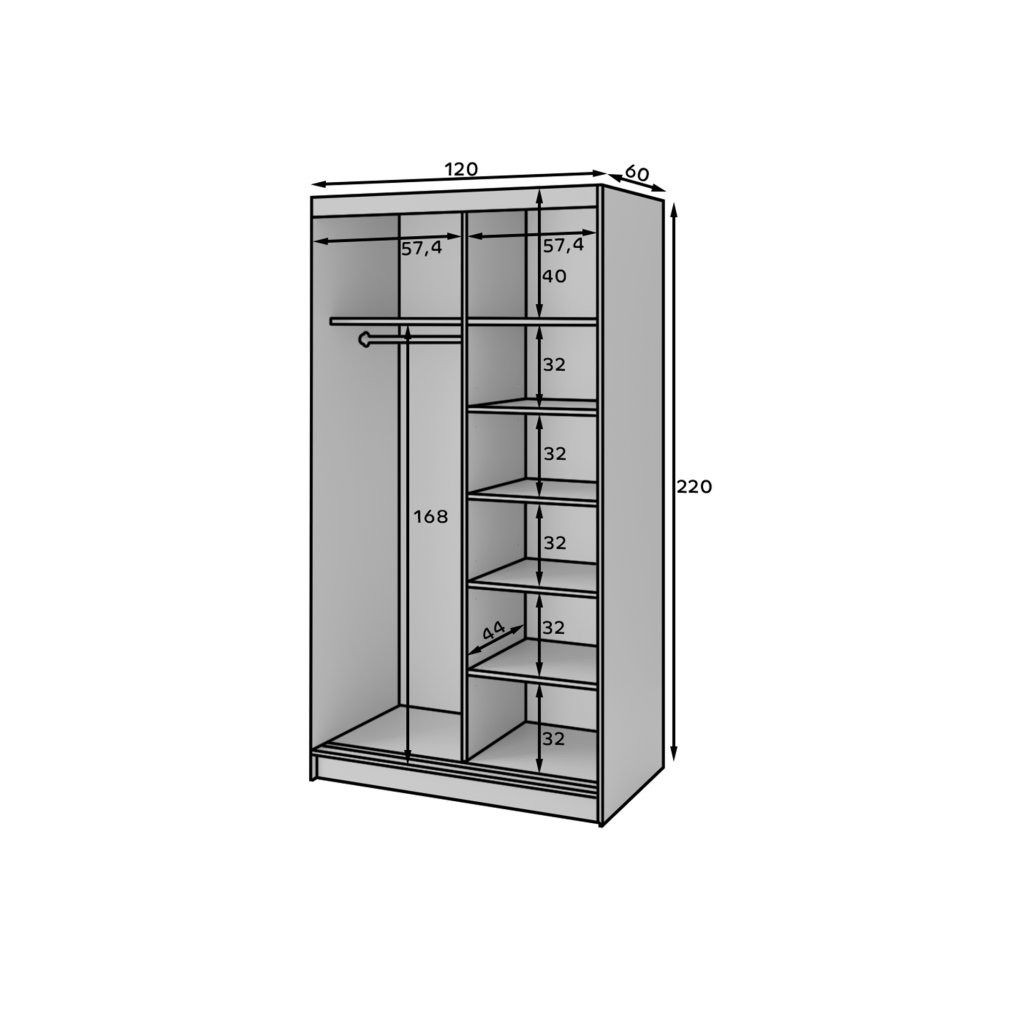 Ormar se odlikuje promišljeno dizajniranom unutrašnjosti koja nudi šest polica za pohranu raznih predmeta, te priložene šipke za vješanje odjeće, što pomaže u održavanju reda i organizacije. Dvoja klizna vrata štede prostor u sobi i otvaraju se glatko i tiho zahvaljujući crno obojanom mehanizmu. Osim toga, priložene zrcalne ploče vizualno povećavaju prostor i nude praktičan element za svakodnevno spremanje.