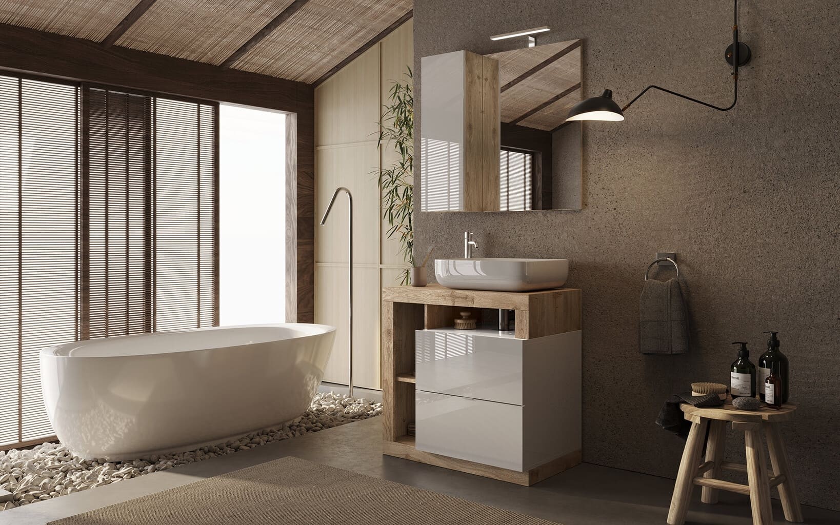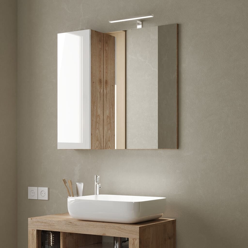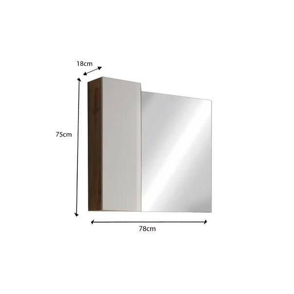 Ormarić s ogledalom i LED svjetlom HAMBURG 432430-778P savršen je izbor za modernu kupaonicu. Elegantna kombinacija bijele boje visokog sjaja i detalja u hrastu stvara osjećaj prostranosti i topline. Ormarić uključuje ogledalo, LED rasvjetu i bočnu kolonu s jednim vratima, što omogućuje praktično odlaganje i estetski izgled.