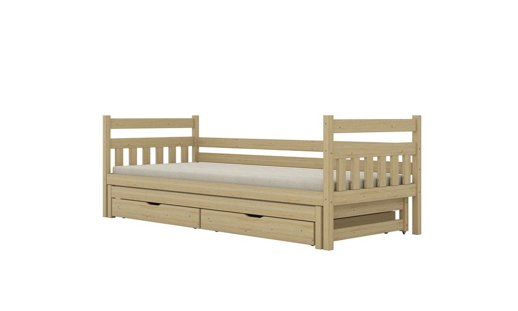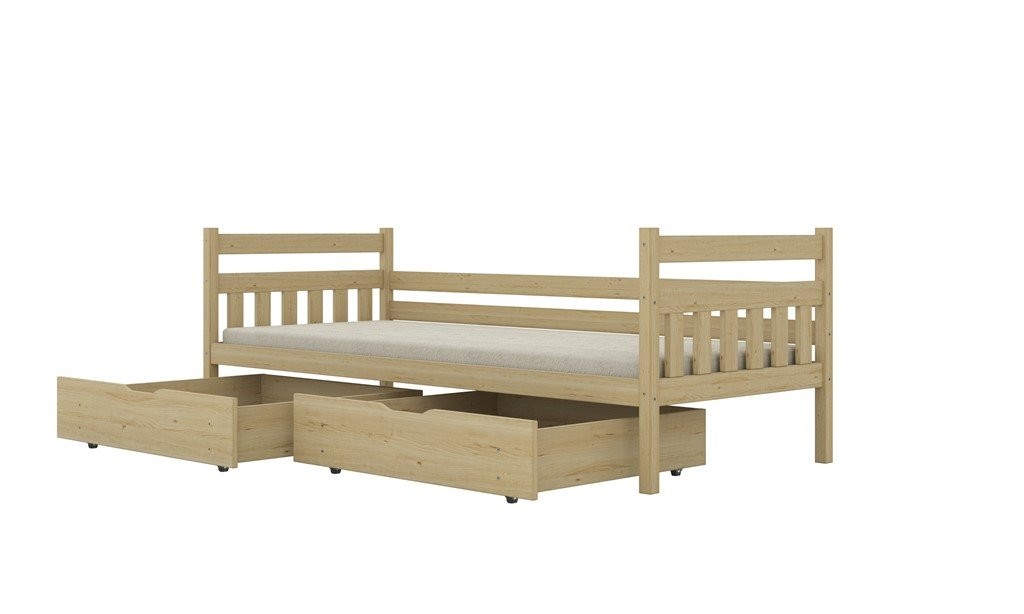 Jednostavan i bezvremenski oblik lijepo se uklapa i u dječju sobu i u suvremeniji prostor za mlade. Zaštitna ogradica pridonosi sigurnijoj upotrebi kod mlađe djece, a ujedno može služiti i kao praktičan naslon. Budući da je krevet dostupan u više dimenzija, lakše se prilagođava prostoru i potrebama korisnika. Možete birati izvedbu bez ladica ili s dvije prostrane ladice u koje možete pospremiti posteljinu, igračke i slične predmete. Moguć je i odabir modela s ležajem ili bez ležaja, kao i vrste ležaja, kako biste odabrali ono što najbolje odgovara vašem djetetu.