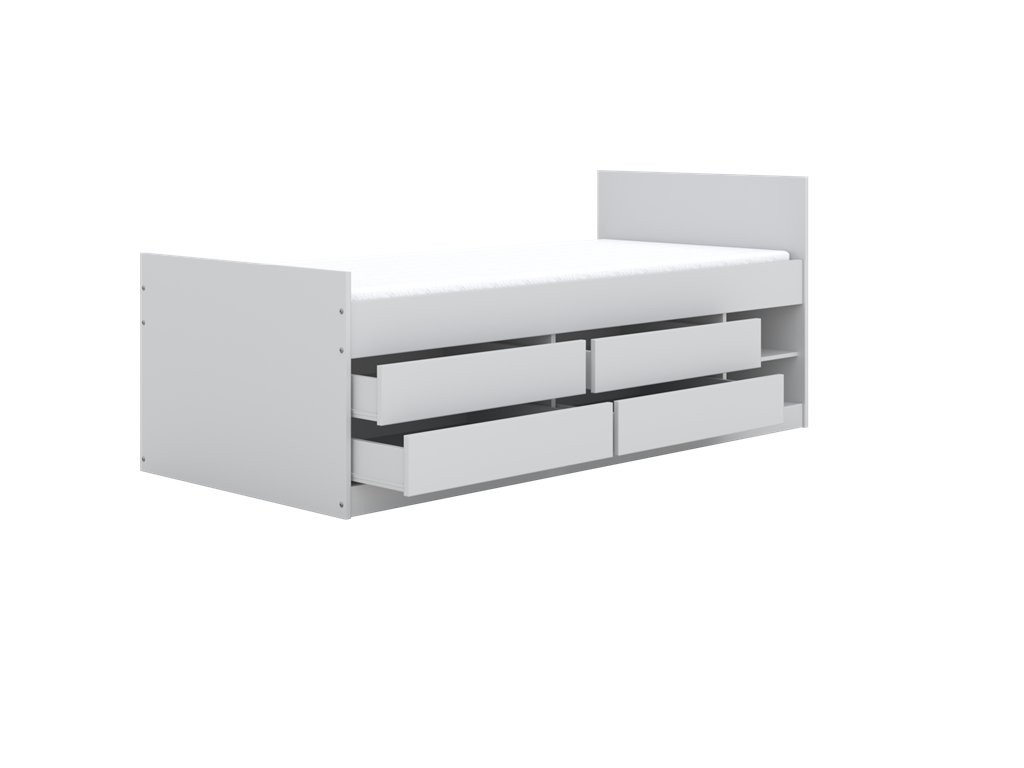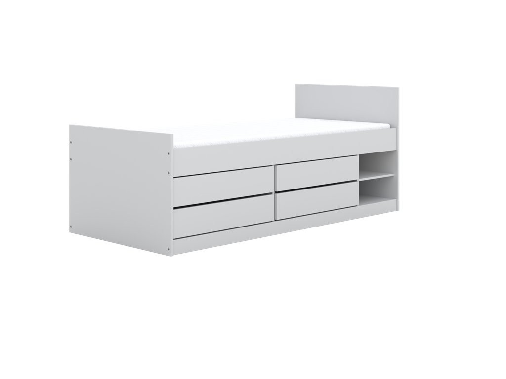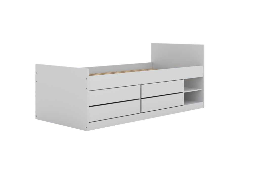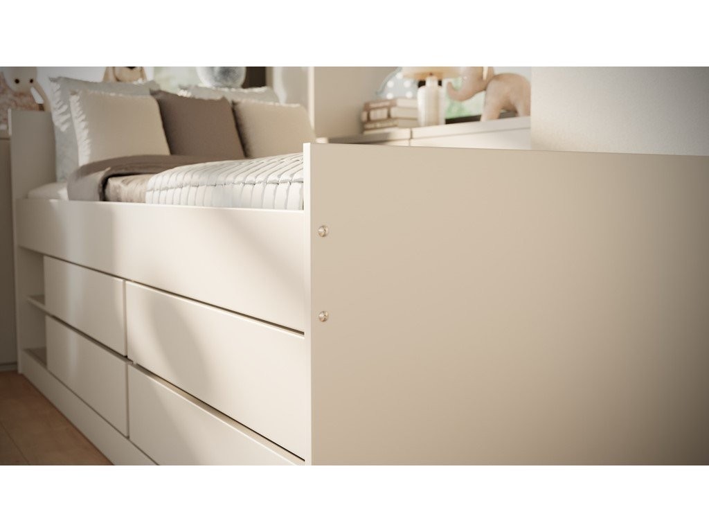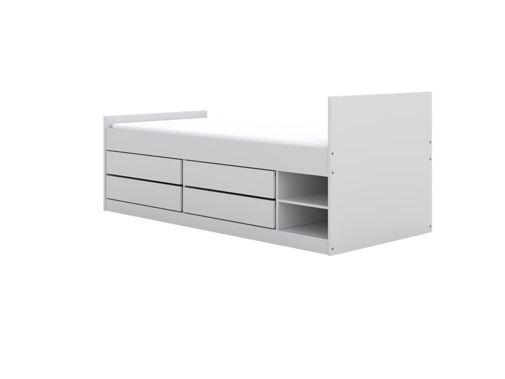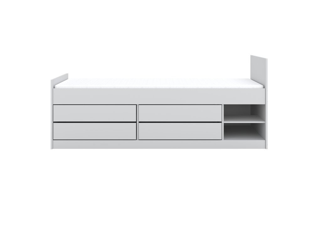 Krevet je osmišljen za suvremenu dječju sobu u kojoj su važni preglednost i funkcionalnost. Opremljen je s 2 otvorene police i 4 prostrane ladice koje omogućuju urednu pohranu posteljine, odjeće, igračaka i drugih dodataka. Konstrukcija omogućuje optimalno kruženje zraka za ugodniji san, maksimalna nosivost iznosi do 100 kg, a dostupan je model bez ležaja ili s ležajem.