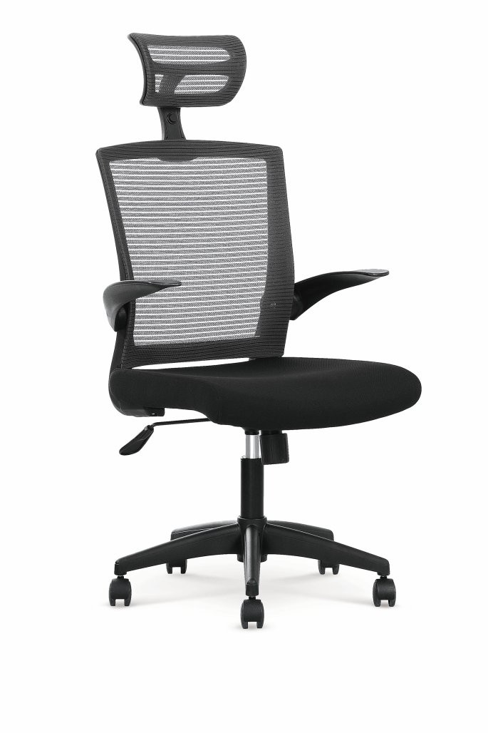 Uredska stolica Vilen s nagibnim mehanizmom, u kombinaciji sivog i crnog platna. Moderno dizajnirana s čvrstim materijalima, pogodna za dugotrajno sjedenje u uredu.