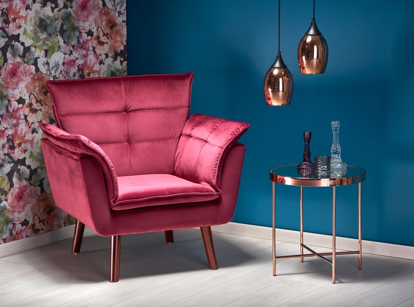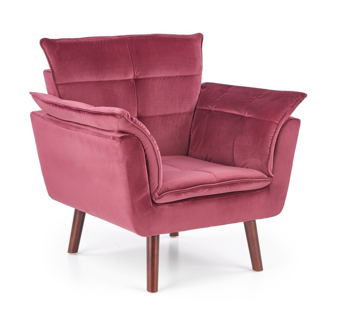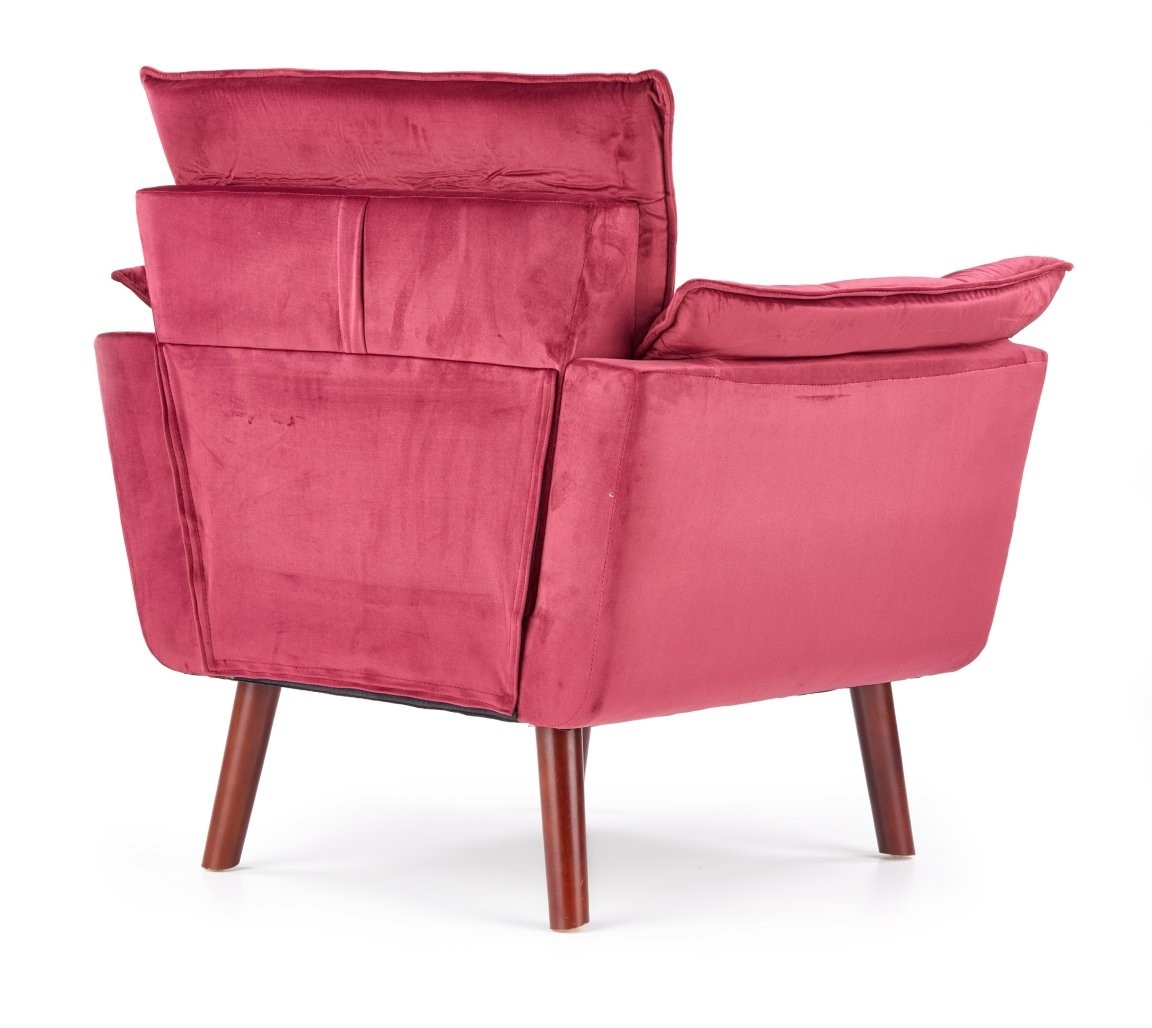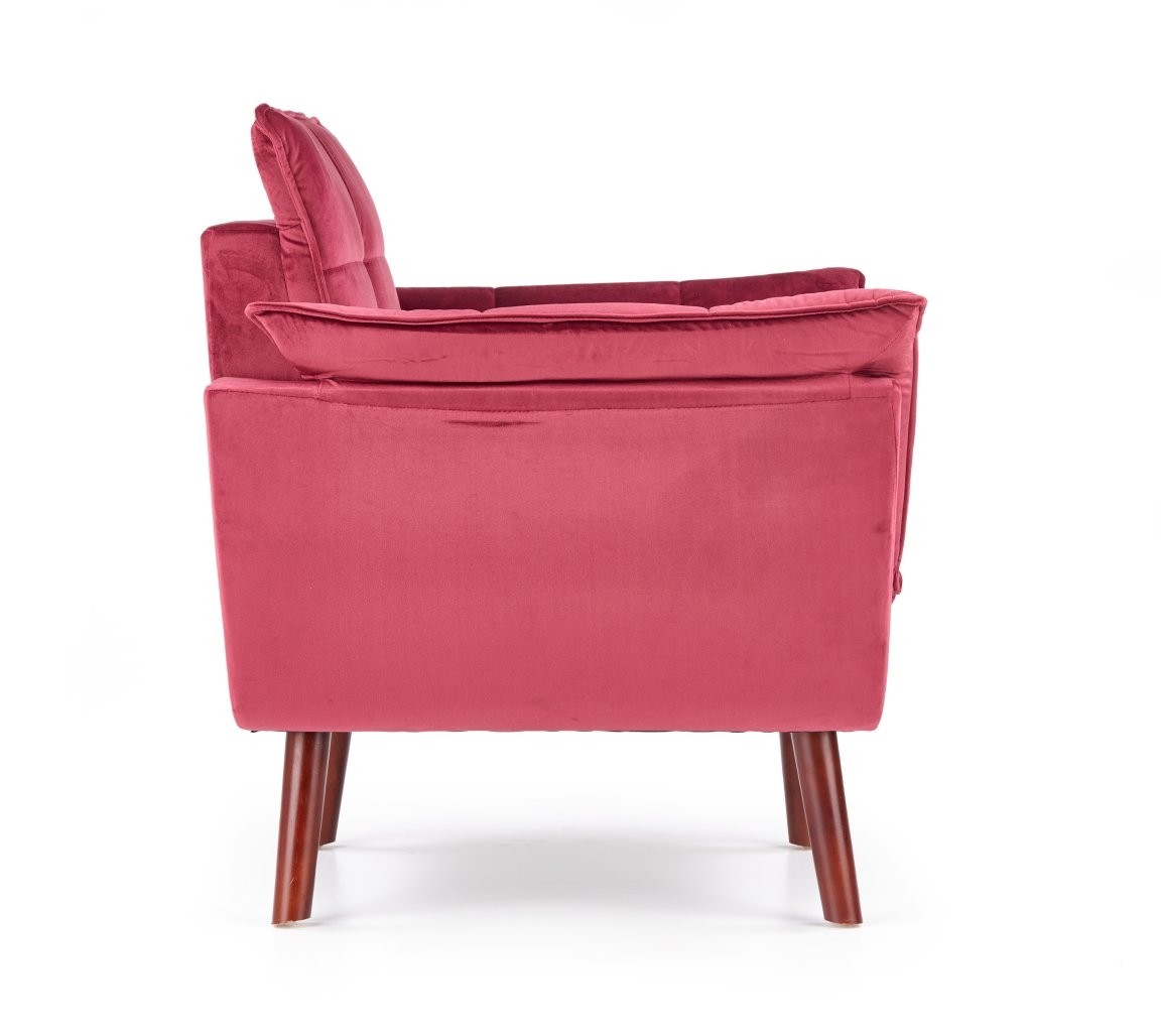 Naslonjač Altor s maroon tkaninom i čvrstim tamno orasovim nogama. Udobno sjedište s elegantnim i modernim dizajnom, koji se uklapa u različite stilove unutrašnjosti.