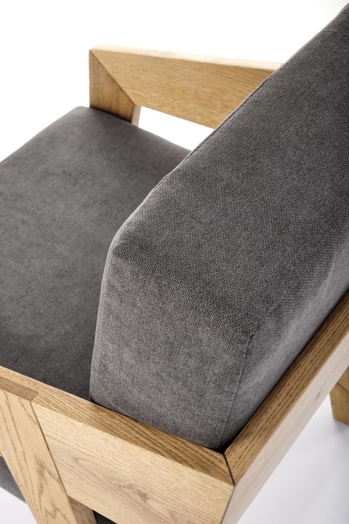 Naslonjač Denlar od tamno sive tkanine i prirodnog hrastovog drveta donosi skandinavski dašak udobnosti u dnevni boravak ili kutak za čitanje.