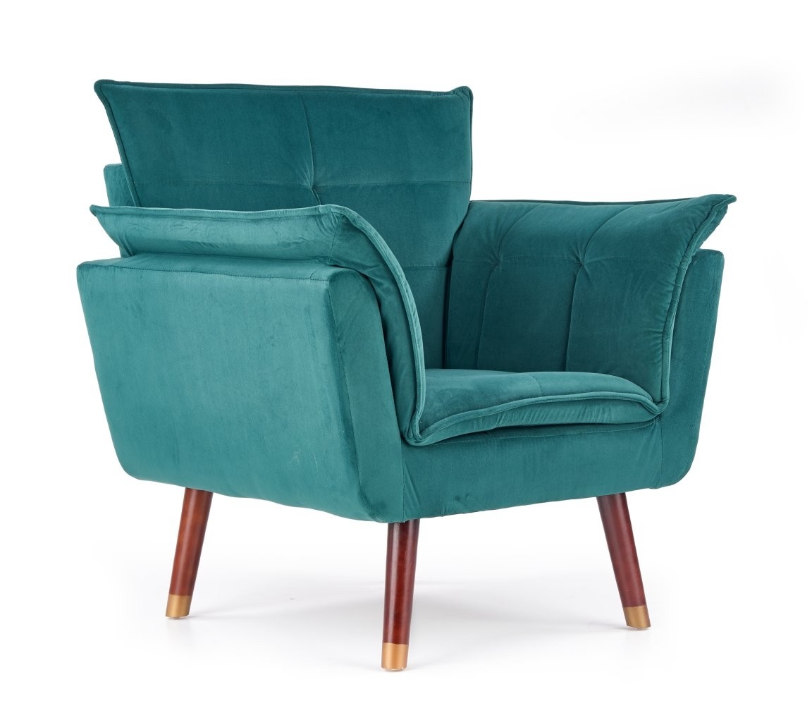 Naslonjač Goren u tamno zelenoj boji s nogama od oraha i zlatnim dodacima. Kombinacija klasičnog i suvremenog dizajna za ugodan kutak za opuštanje.