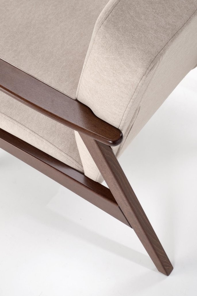 Naslonjač Varion u retro stilu donosi eleganciju i udobnost. Izrađen je od tkanine u bež boji s drvenim nogama od tamnog oraha. Dimenzija 65 x 77 x 77 cm čini ga idealnim dodatkom za svaki dom.