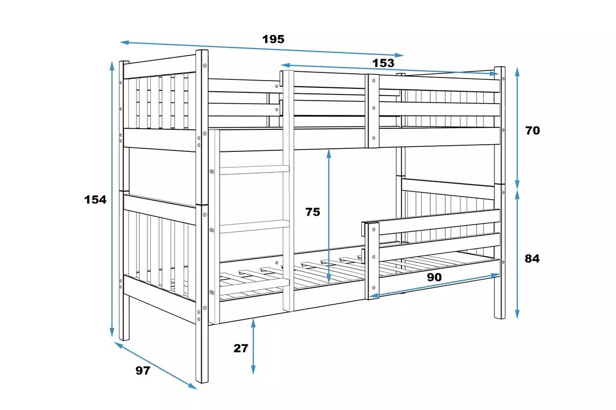 Krevet na kat KACPER modernog je izgleda. Okvir kreveta izrađen je od kvalitetnog i izdržljivog borovog drva koje nije lakirano. Krevet na kat može se preurediti u dva odvojena kreveta. Madrac nije uključen. Maksimalna nosivost konstrukcije je 100 kg po razini.