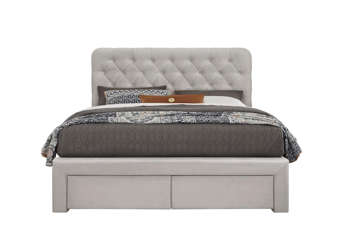 Krevet Elor, tapeciran baršunastim materijalom, s dva prostrana spremišta i elegantnim prestižnim stilom. Dostupan u više boja.