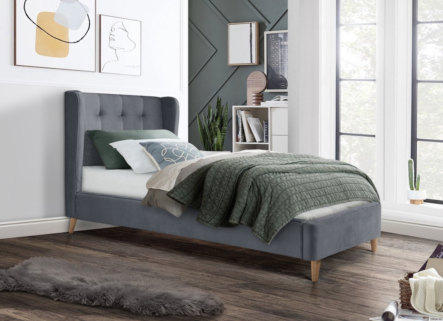 Krevet Faronir s mekim baršunastim presvlakom u sivim i ružičastim tonovima. Dodaje eleganciju i toplinu modernoj spavaćoj sobi.