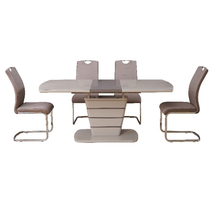 Gornja ploča i stup izrađeni su od MDF materijala visokog sjaja i presvučeni matiranim staklom. Na sredini stola nalazi se kontrastni nastavak koji se lako može izvući i tako produžuje stol.