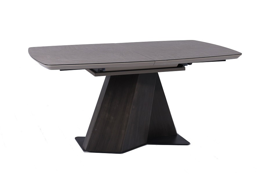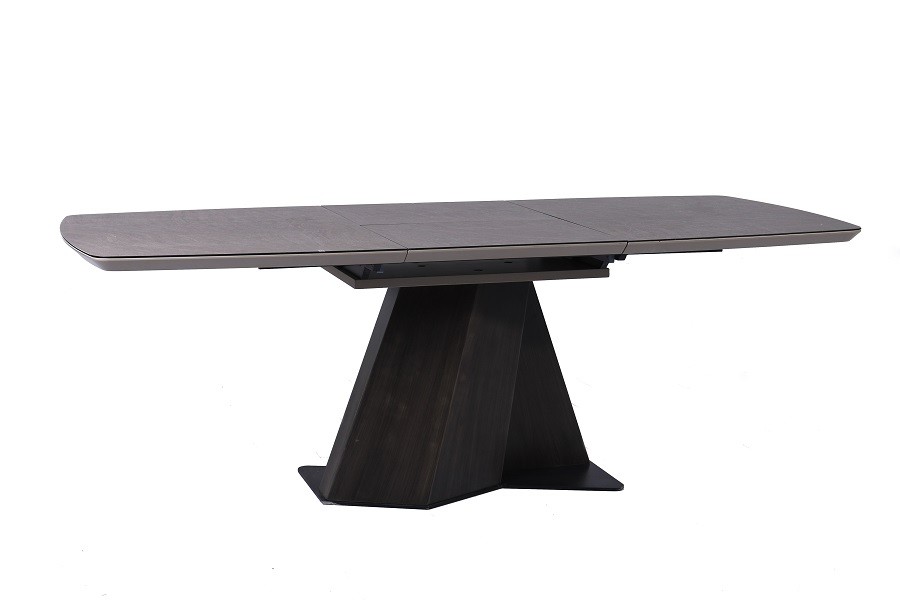 Produžni stol AZALEA ima keramičnu ploču u melanin boji. Rub ploče u cappuccino mat boji. Postolje i stub su obrađeni s grubim prašnim lakiranjem u crni boji.