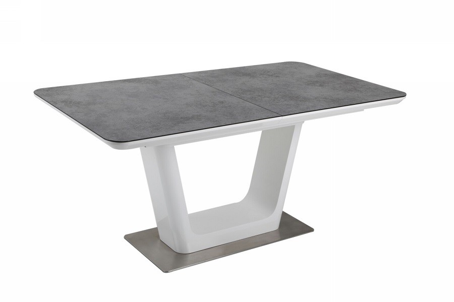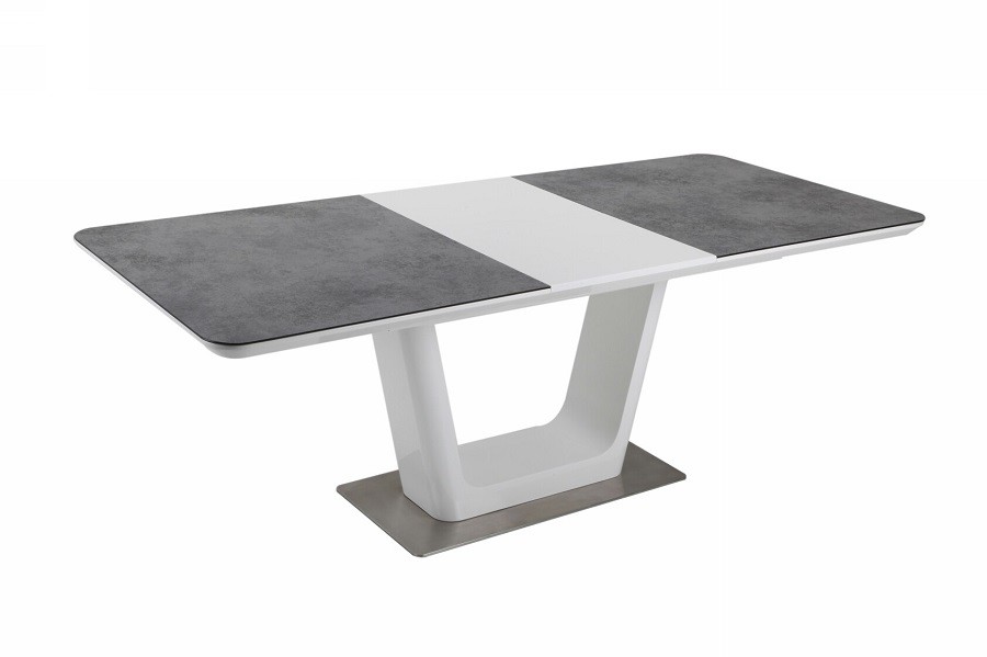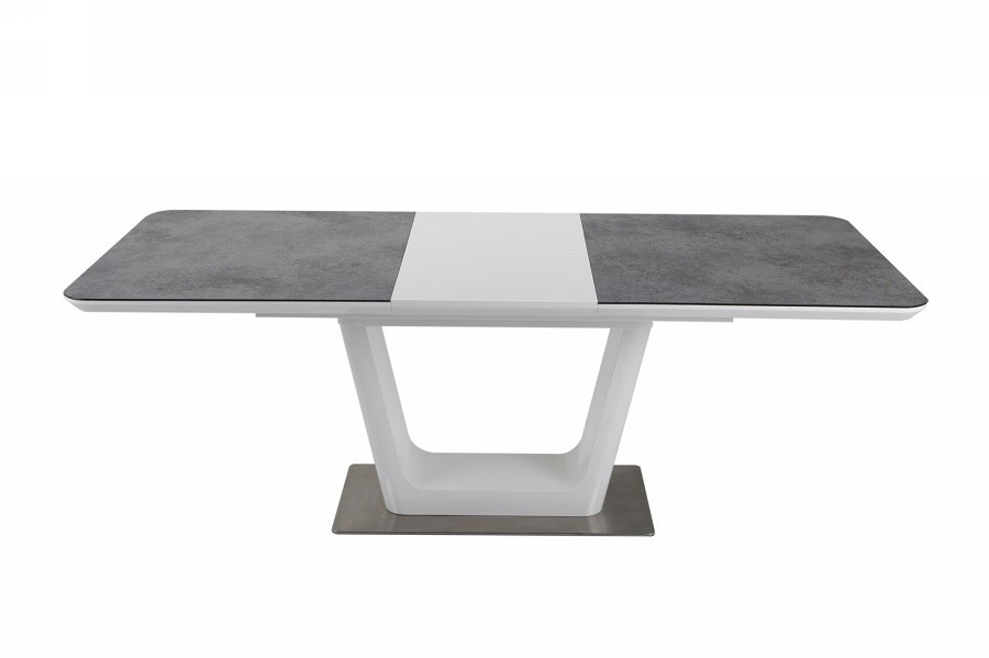 Produžni stol LOREM je u bijeli boji s kombinacijom sive. Gornja ploča stola je iz MDF materijala i ima posebno 5mm debelo sivo staklo. Donja ploča i stub su u bijeli boji i iz MDF materijala. Postolje je iz nehrđajučeg čelika. Produžni dio je jednostavan za otvaranje.