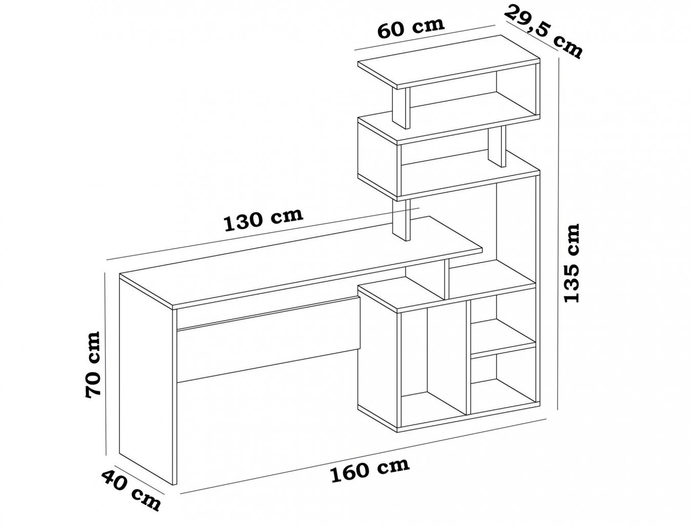 Radni stol dimenzija 130 cm širine, 70 cm visine i 40 cm dubine pruža dovoljno prostora za knjige, laptop i ostale materijale. Dodatni ormar dimenzija 60 cm širine, 135 cm visine i 29,5 cm dubine nudi dodatni prostor za pohranu. Višestruke police omogućuju uredno organiziranje i lak pristup najvažnijim stvarima.