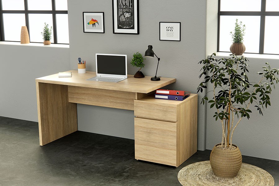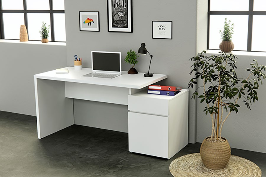 Radni stol HAVEN je prostoran radni stol. Na raspolaganju je u bijeli ili hrast boji. Uključena je komoda s jednom ladicom i manjim ormaričem.