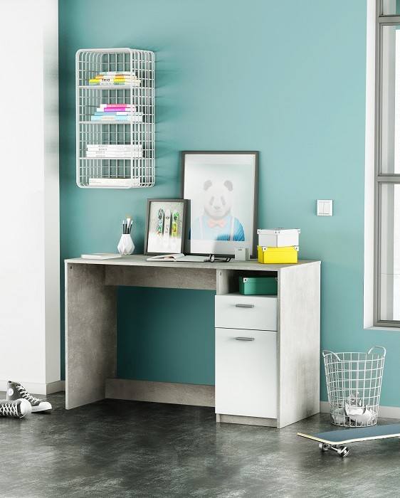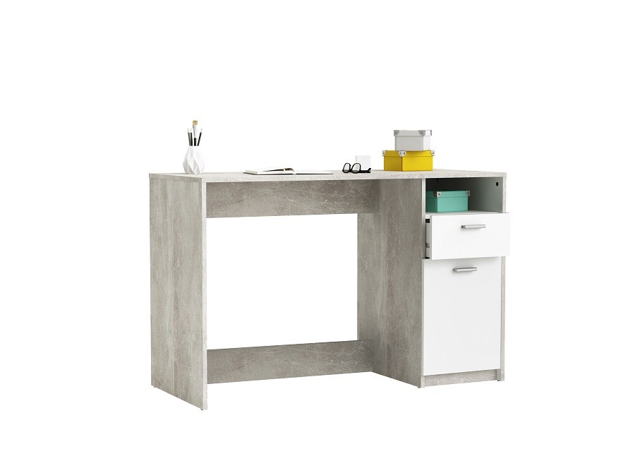 Radni stol HUSTON je jednostavan radni stol u kombinaciji bijele boje i imitacije cementa. Na desnoj strani ima ladicu i ormar u kojem je polica, koja je podesiva na tri različite visine. Stol je iz iverice debljine 15 mm.