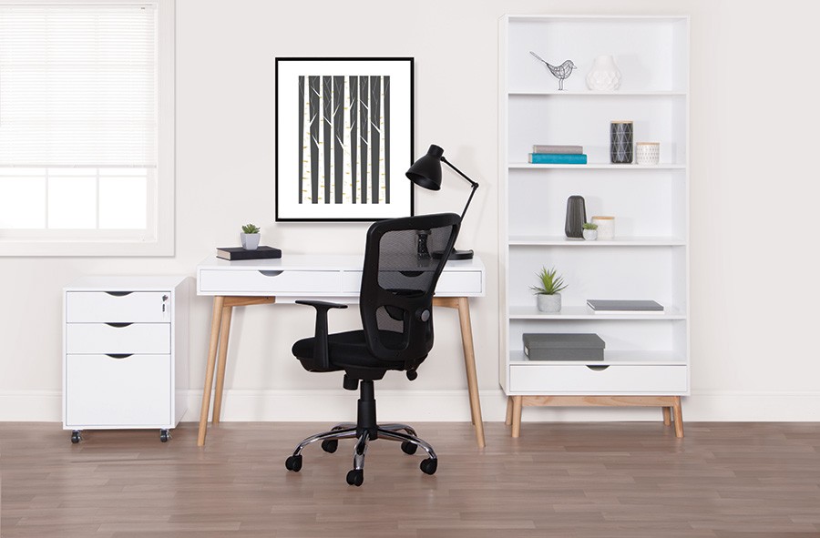 Radni stol NORDIC je uredski stol u bijeli boji s nogami u natur boji. Ima ladicu po cijeli dužini stola. Pogledajte si i policu i ladičar iz tog programa.