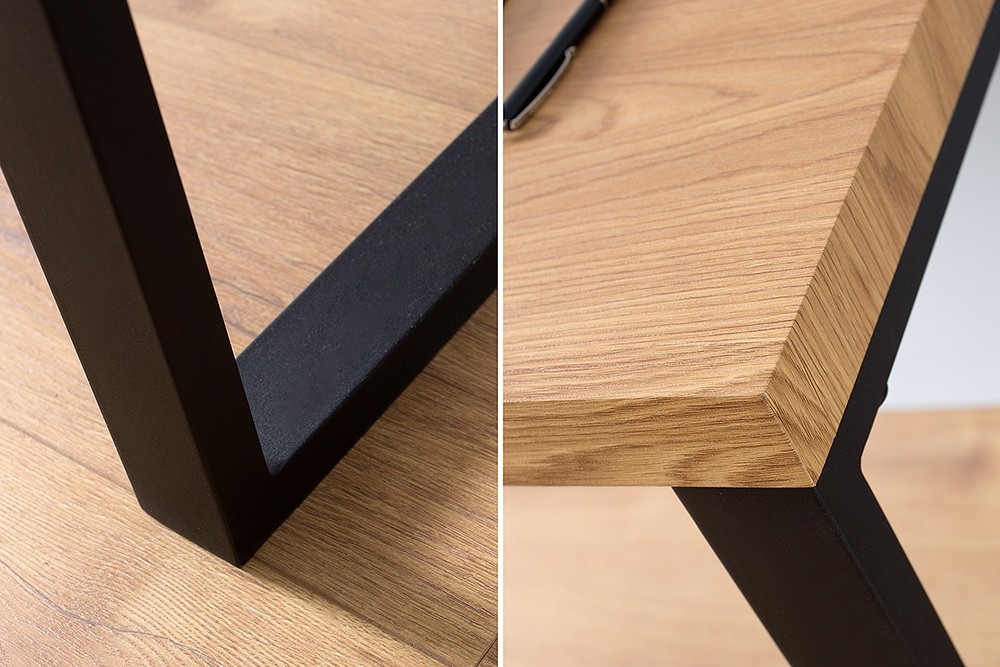 Radni stol OLIMPIA dostupan je u modernoj kombinaciji crne te boje tamnog hrasta, koja se odlično uklapa u svaki dom. Zbog svog jednostavnog izgleda, može se upotrebiti u domaćem uredu ili u dječjoj sobi. Stol je sastavljen od ploče u lakiranom melaminu i metalnih nogica u crnoj boji. Maksimalna nosivost stola je 80 kg.