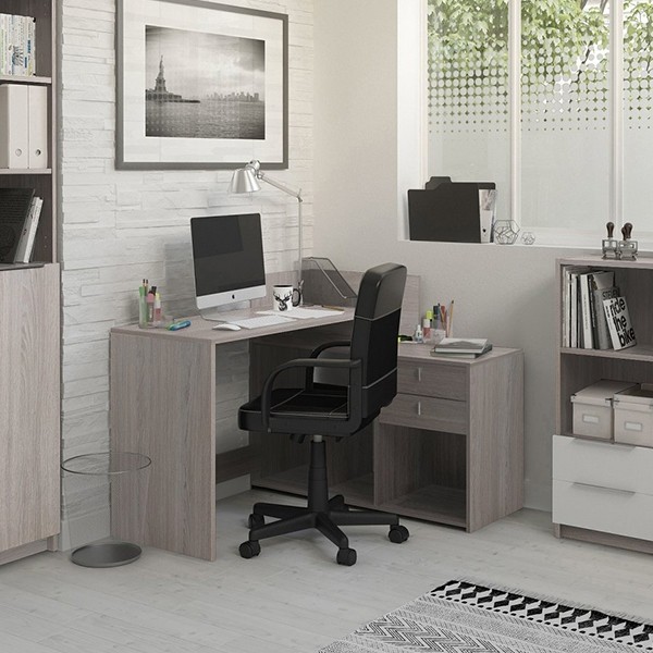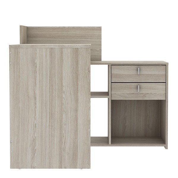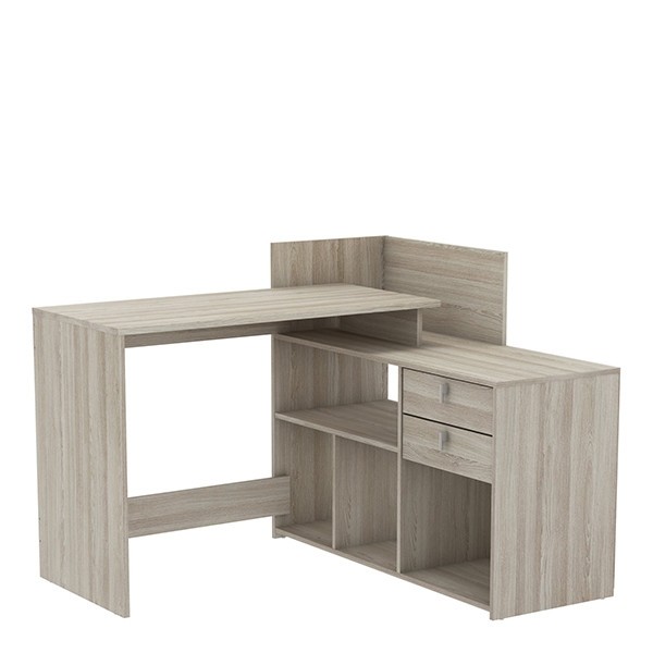 Radni stol VISTA izvrstan je za sve kojima je potrebno puno prostora za pohranu. Dvije ladice i četiri prostrane police nude obilje radnog i skladišnog prostora. Osim izvrsne funkcionalnosti, stol se može pohvaliti lijepim i jednostavnim dizajnom koji se savršeno uklapa u svaku prostoriju. Dostupan je u imitaciji hrasta.