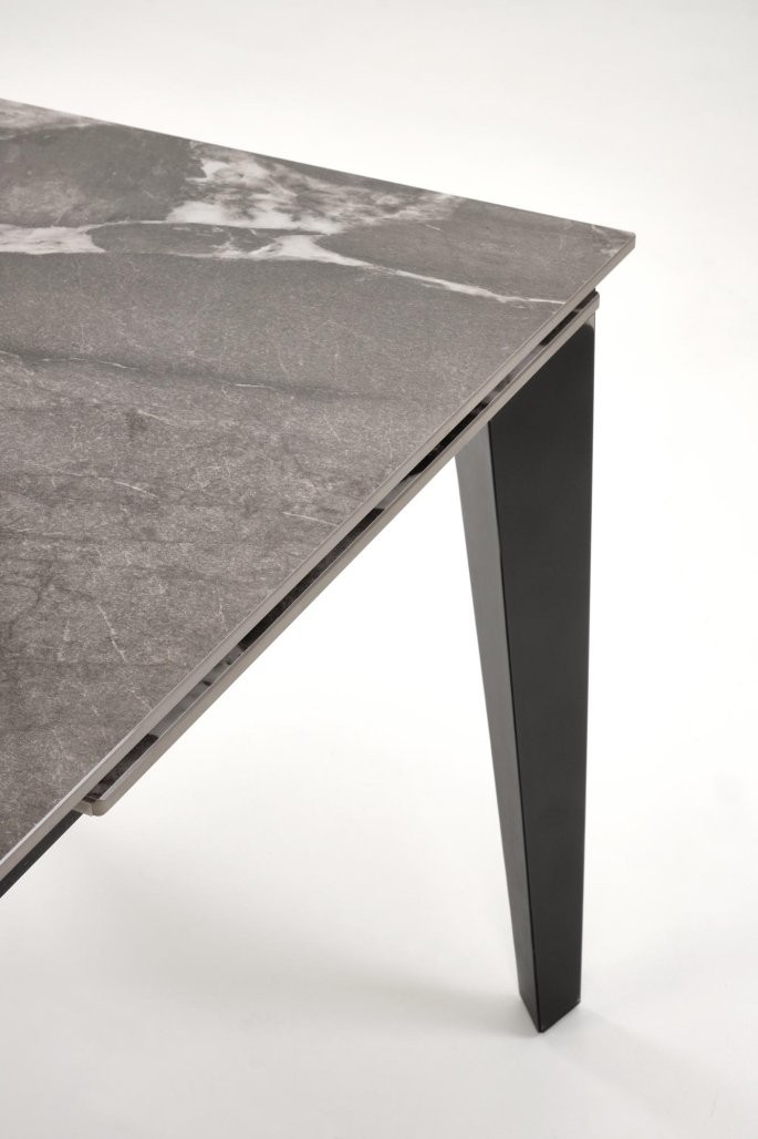Produžni blagovaonski stol Alerin u modernom stilu s mramornom površinom sive boje i crnim metalnim okvirom. Praktičan izbor za veće blagovaonice, prilagodljiv veličini.
