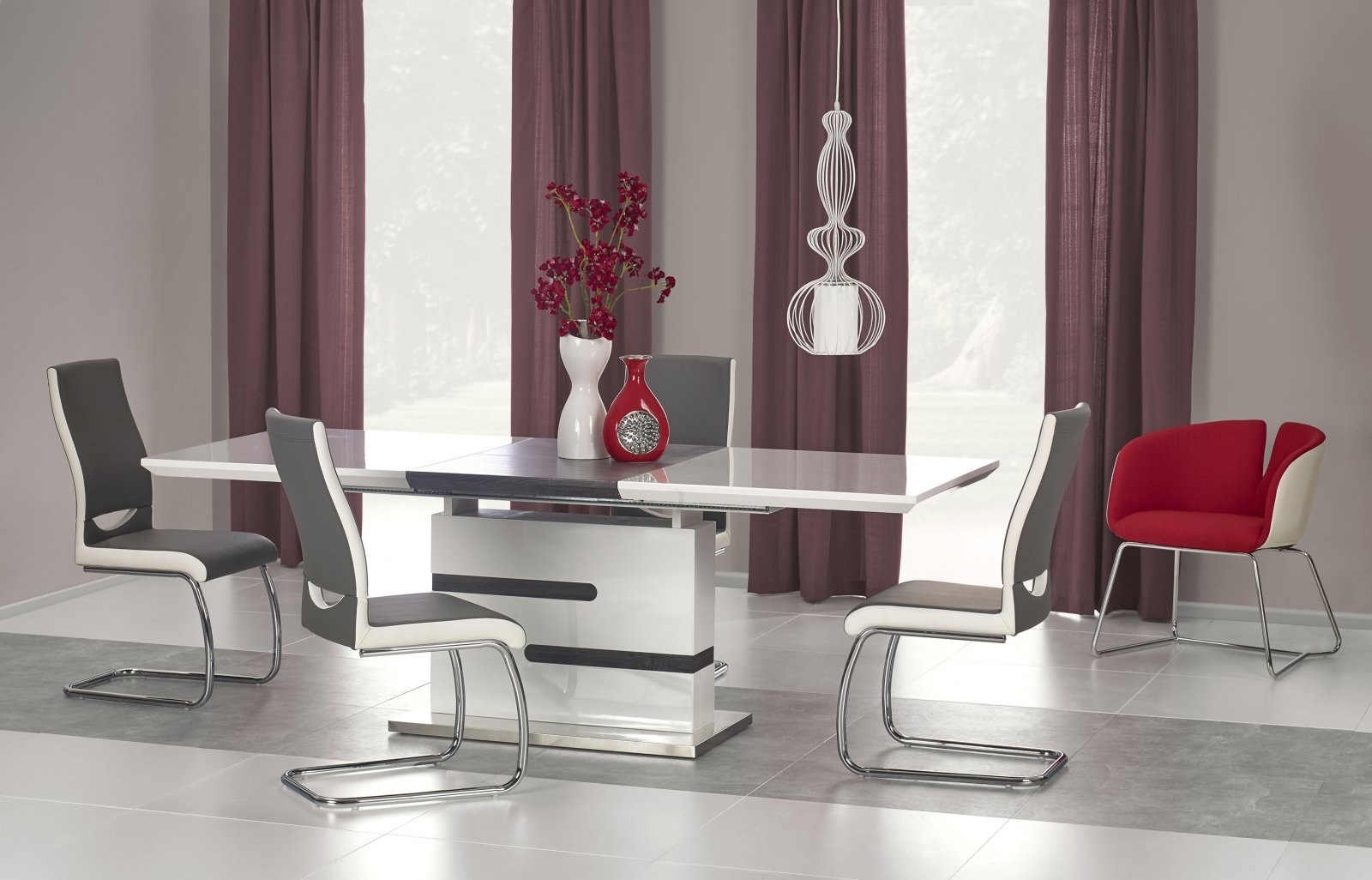 Produžni blagovaonski stol Asir od lakiranog MDF-a i nehrđajućeg čelika u bijeloj i sivoj boji. Moderan i prestižan dizajn, prikladan za šest do osam osoba s podesivom duljinom.