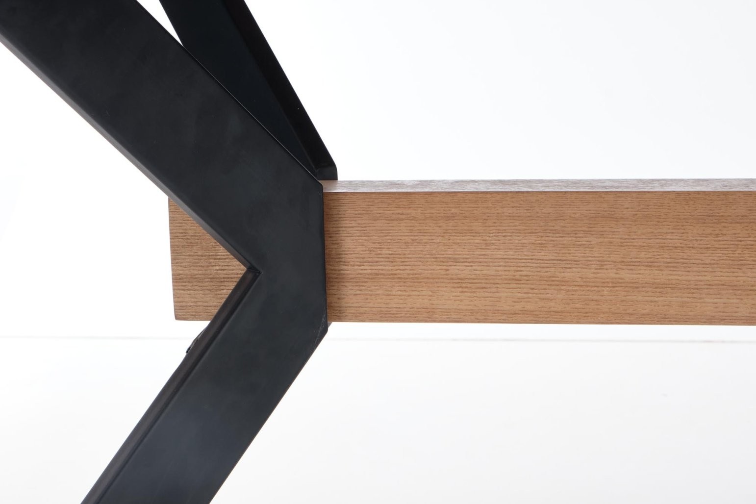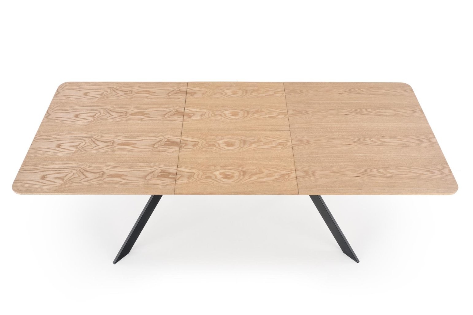 Produživi stol Delin s površinom od prirodnog hrasta i crnim metalnim nogama u stilu. Prilagodljiv dizajn za 6 do 8 osoba, idealan za veće obroke i okupljanja.