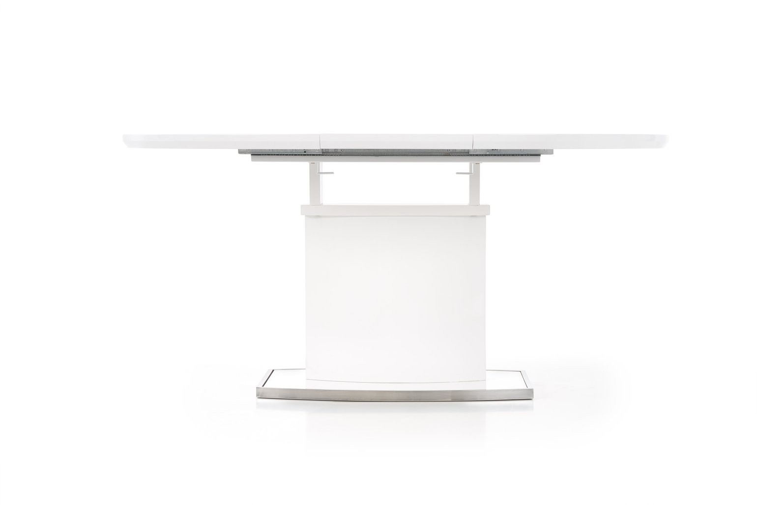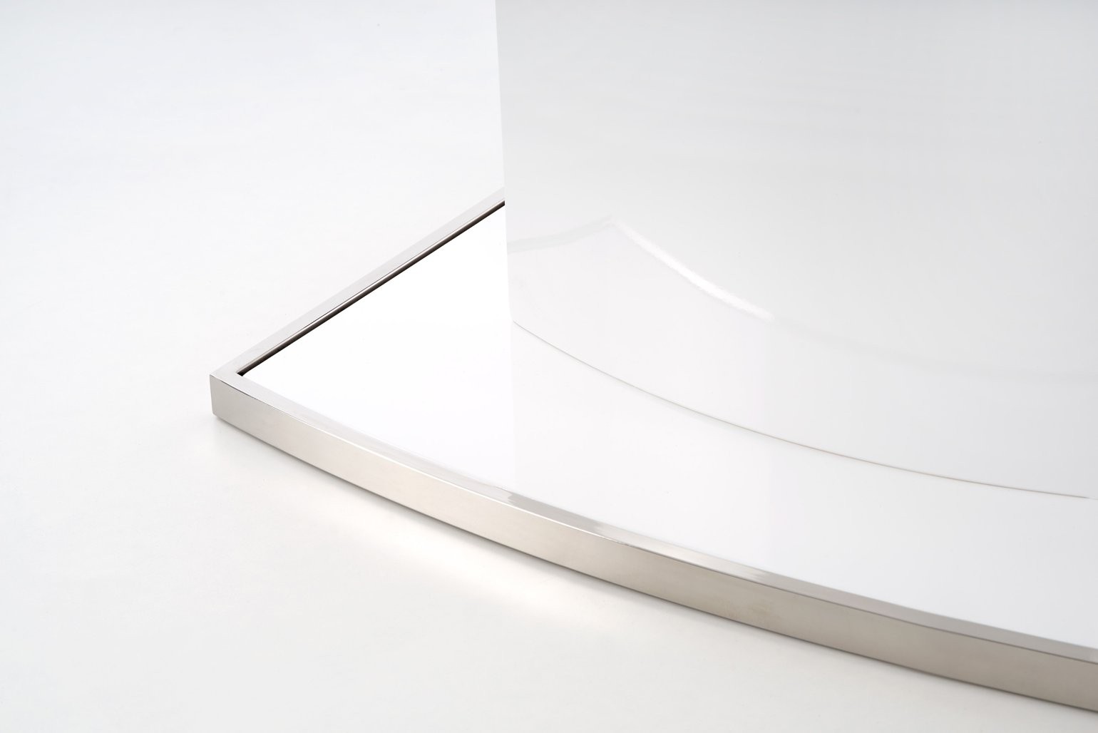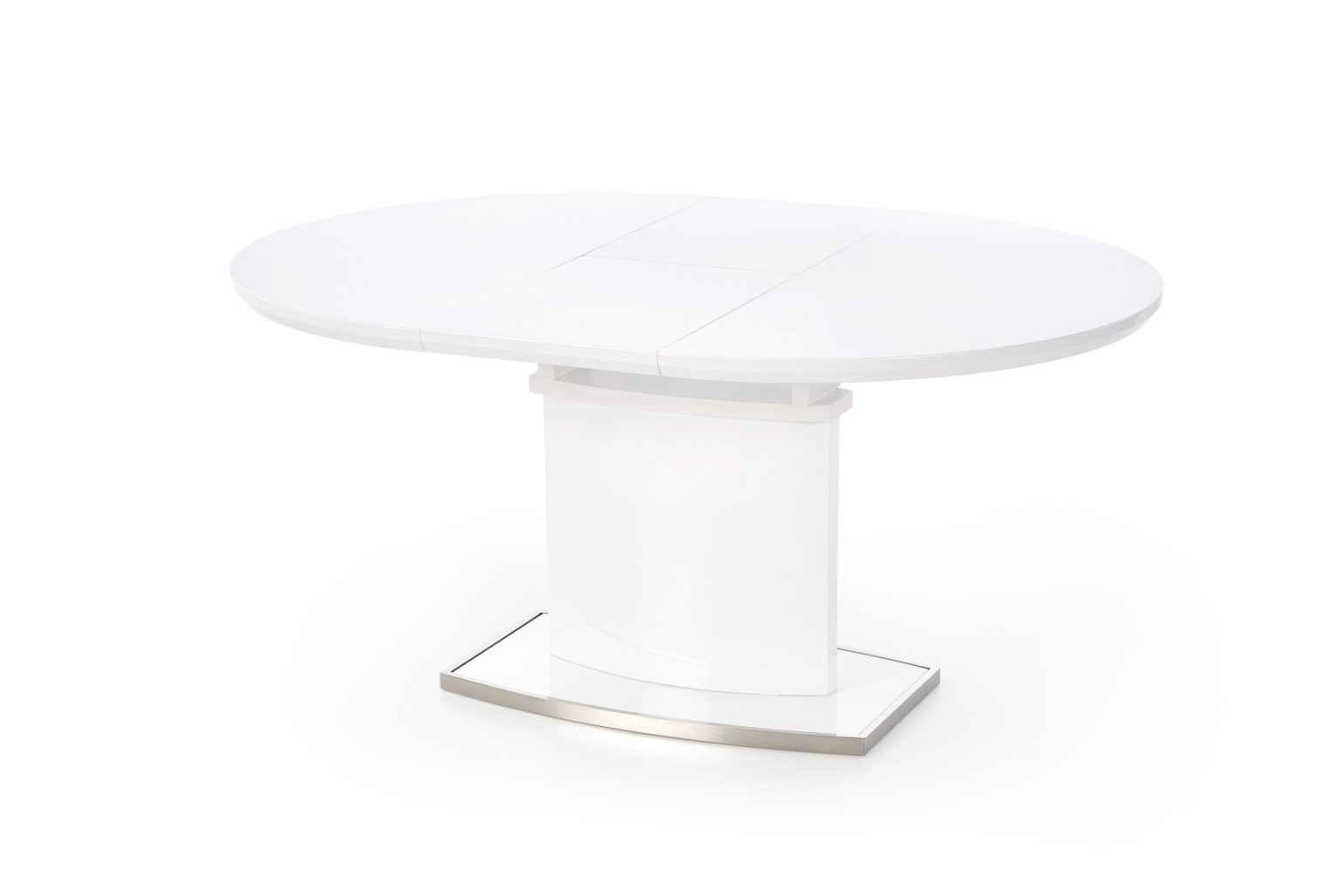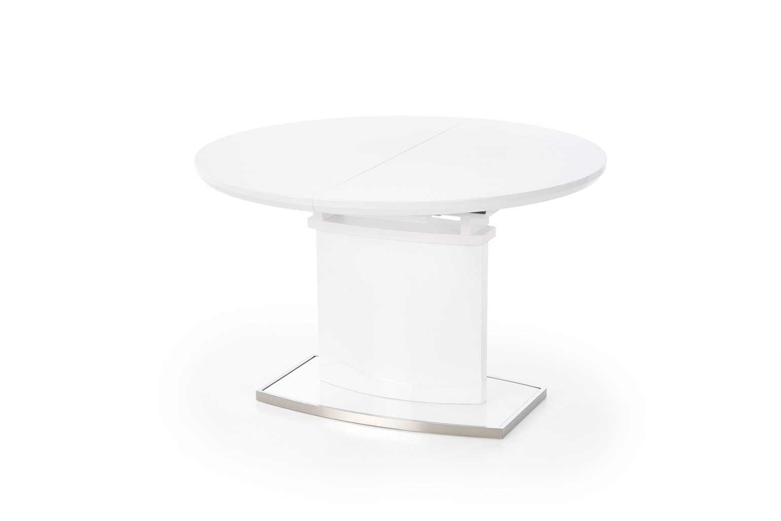 Produžni blagovaonski stol Jeril izrađen je u prestižnom stilu s kružnom bijelom lakiranom MDF pločom, koja omogućuje prilagodljivu duljinu od 120 do 160 cm. Pruža prostor za 4 do 6 osoba i elegantno upotpunjuje suvremeni blagovaonski prostor.
