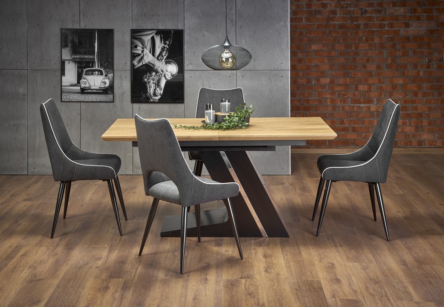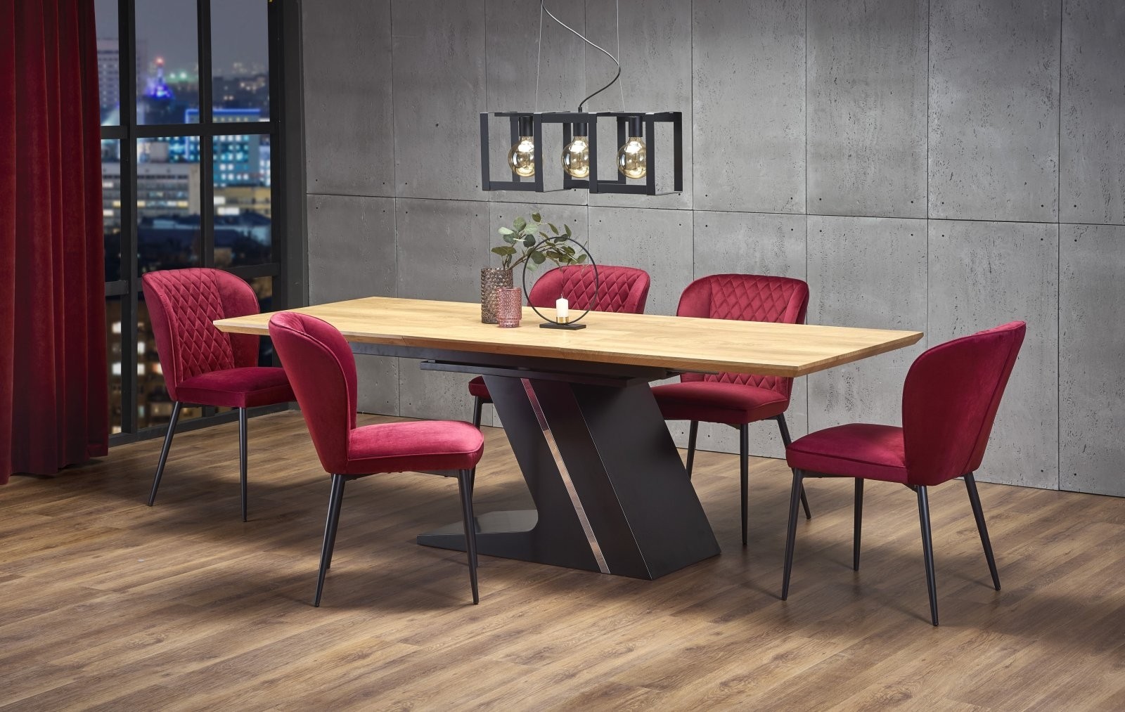 Produžni blagovaonski stol Revor modernog dizajna nudi svestranost s prirodnom MDF površinom u izgledu hrasta i metalnim okvirom. S mogućnošću proširenja od 160 do 220 cm, prikladan je za 6 do 8 osoba, što omogućava prilagodljivu uporabu u blagovaonicama svih veličina.
