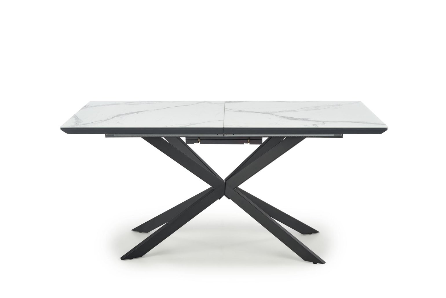 Produžni blagovaonski stol Rolar u modernom stilu s keramičkom pločom i lakiranim MDF-om u bijeloj mramornoj boji. Podesiva duljina od 160 cm do 200 cm, prikladno za 6–8 osoba s crnim metalnim nogama.