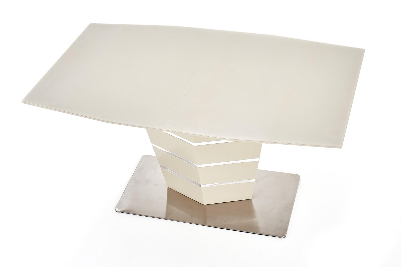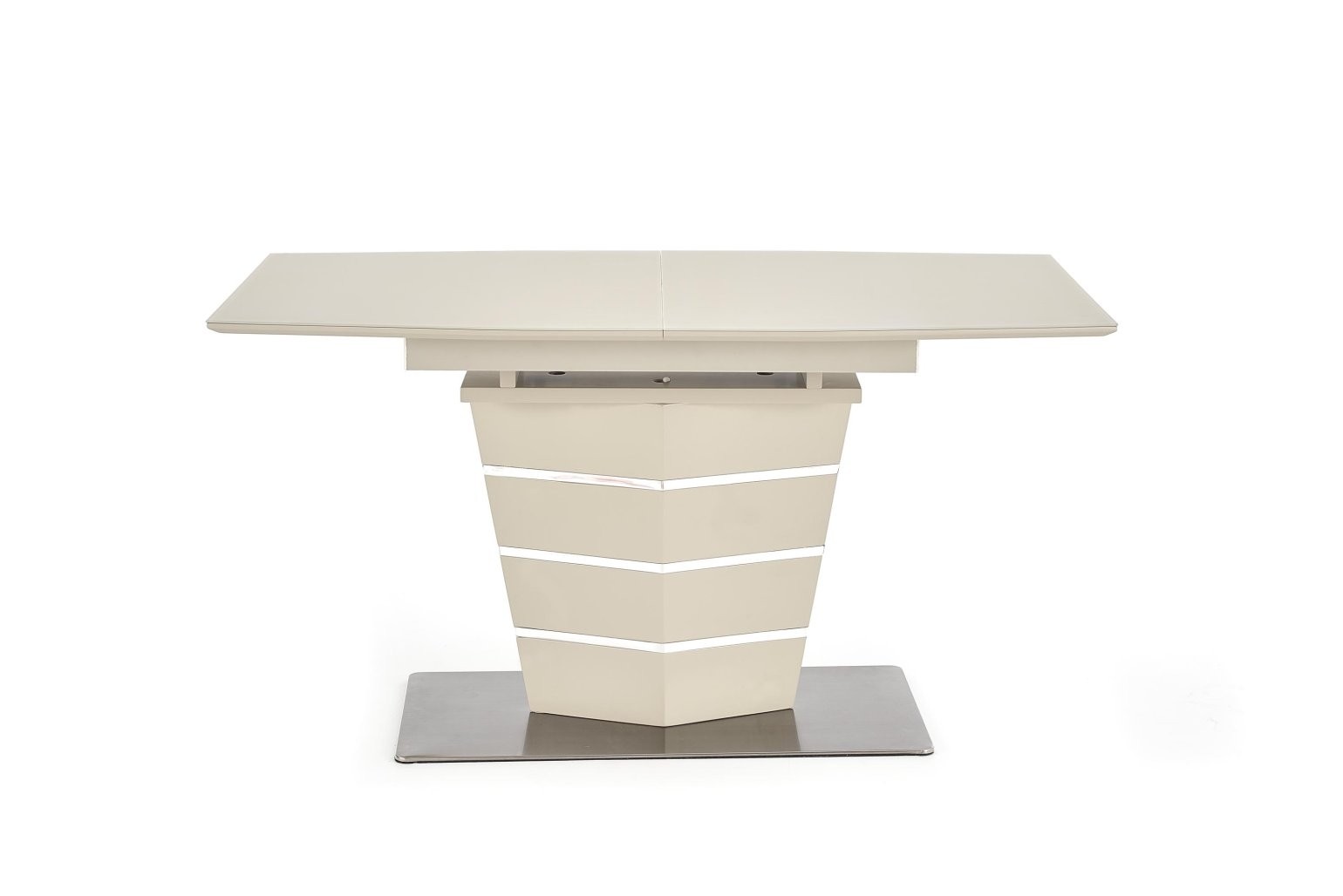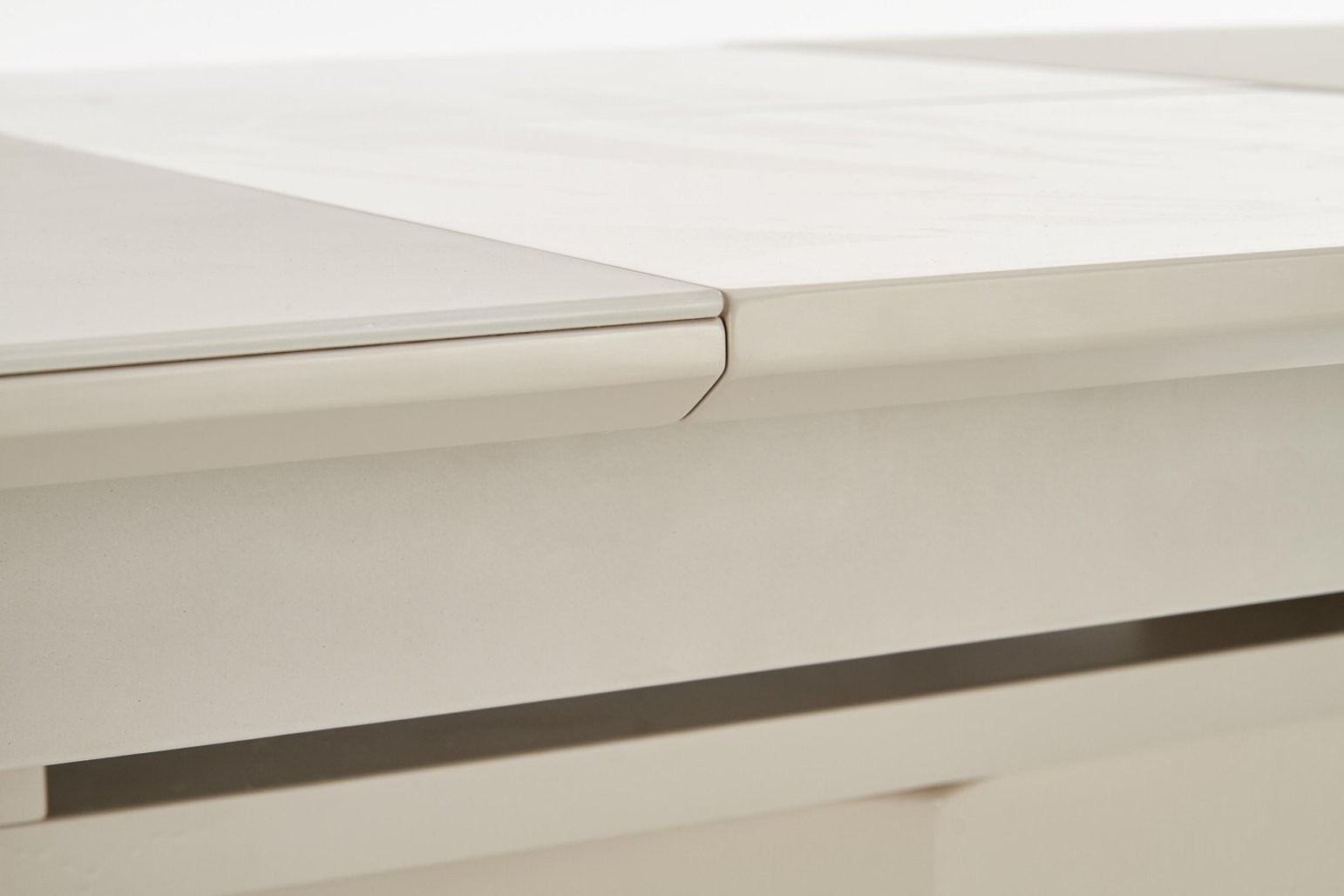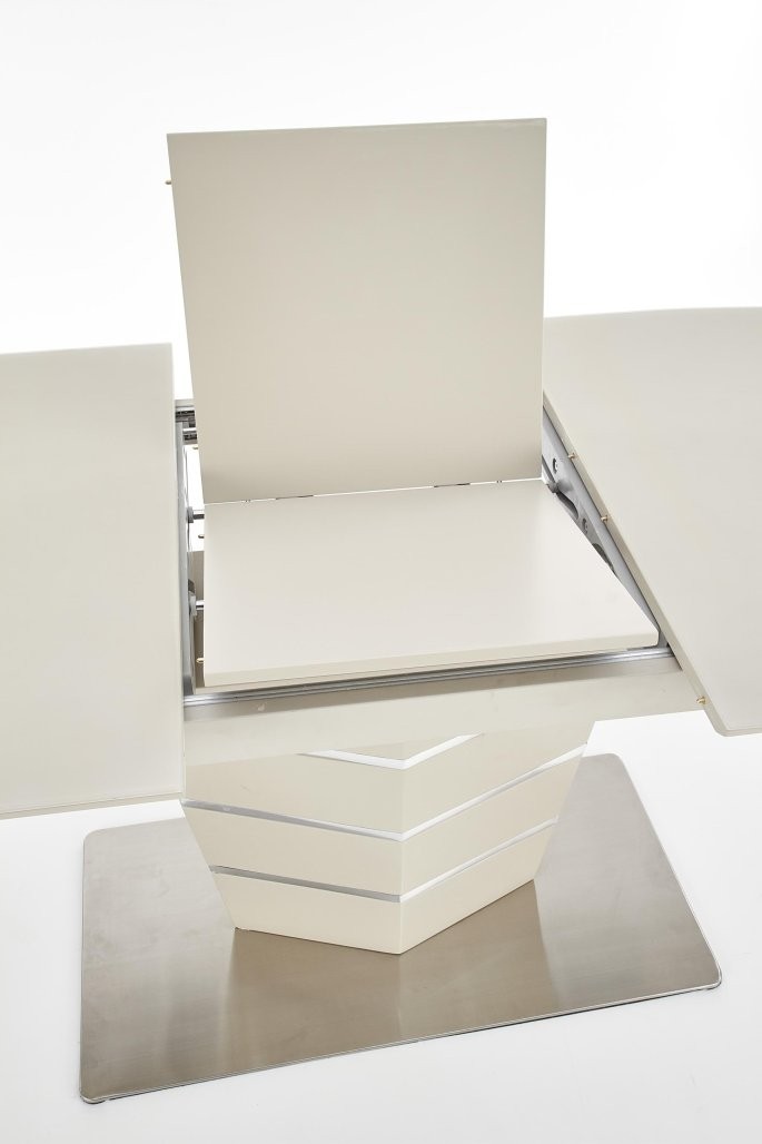 Produžni stol Ulorn sa staklenom i MDF površinom u bež mat nijansi. Dimenzije od 140 do 180 cm, prikladan za 6 do 8 osoba, s metalnim okvirom.