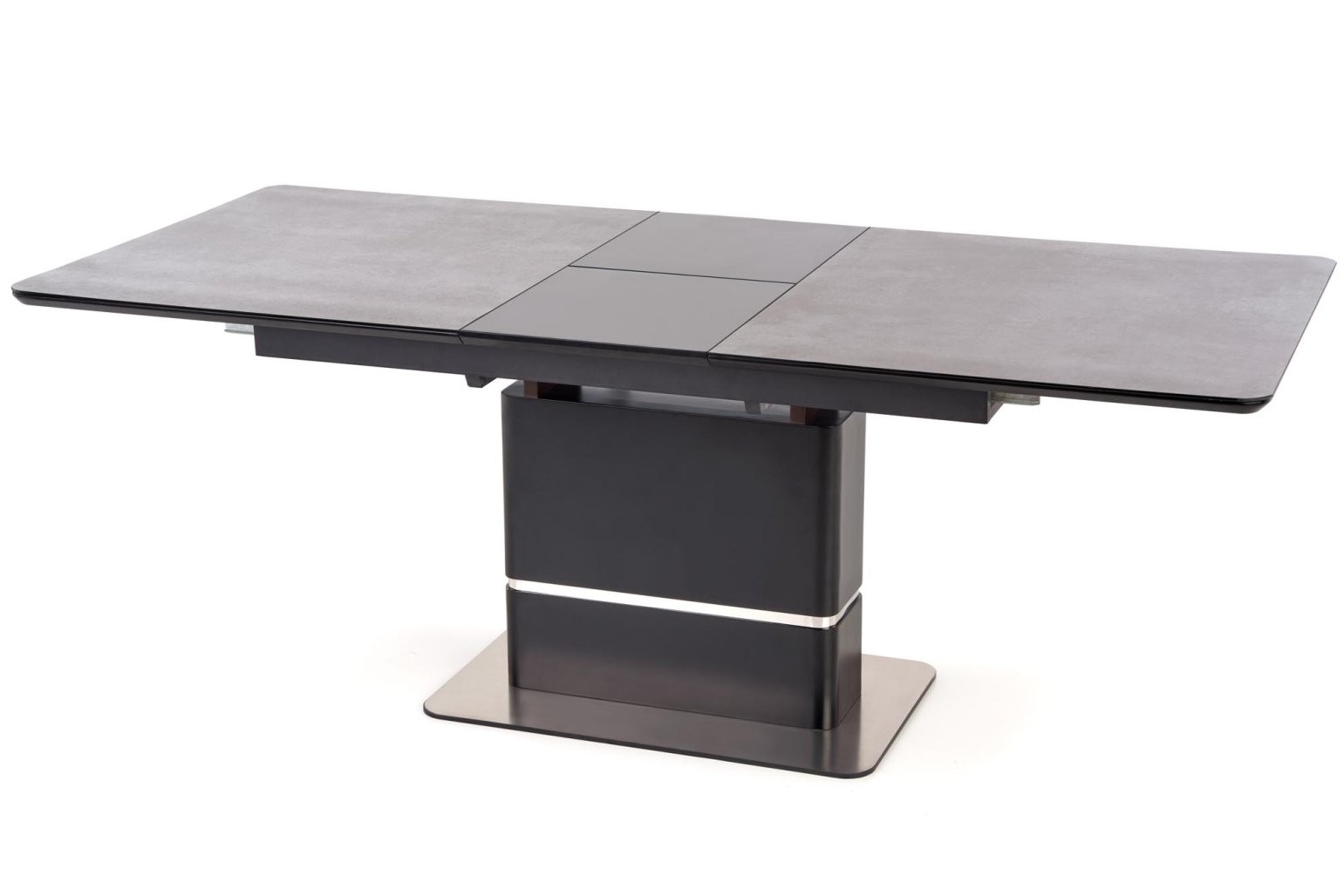Produžni blagovaonski stol Veln s tamnosivom staklenom pločom i crnim metalnim nogama. Moderan oblik s opcijom proširenja, idealan za 6 do 8 osoba.