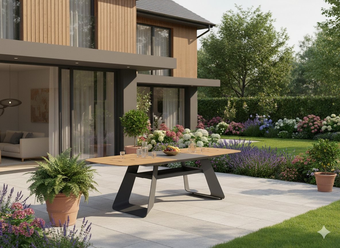 Razvlačivi vrtni stol Tomson (siva) donosi promišljeno rješenje za korištenje u vrtu, na terasi, balkonu ili u patio prostoru. Izvedba u nijansama siva, siva + efekt drva omogućuje jednostavno usklađivanje s različitim vanjskim ambijentima. Materijali, kao što su aluminij, blacha aluminijasta o debeline 5 mm, grawerowana, doprinose urednom izgledu i praktičnoj upotrebi.