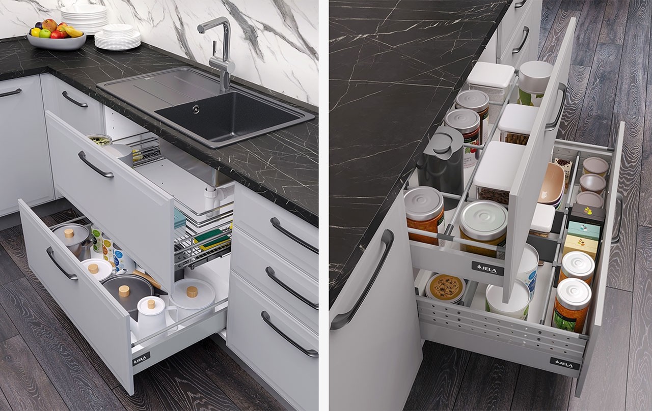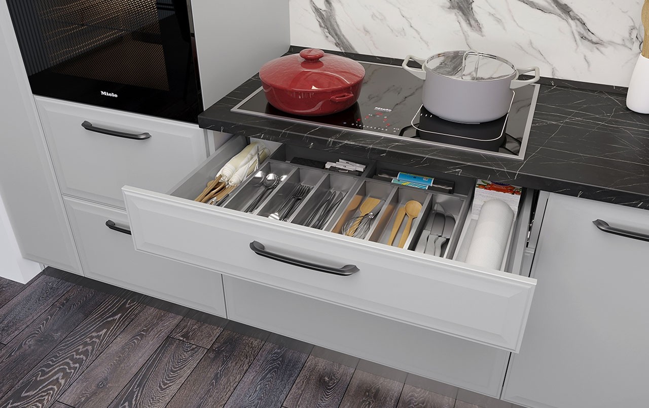 Kuhinja EVIA dostupna je u univerzalnom dizajnu koji se slaže i s modernim i s klasičnim stilom, pa izgleda sjajno u svakom domu! Dostupana je u svijetloj boji sive perle koja se lako kombinira s bilo kojom drugom bojom, tako da će se kuhinja lijepo uklopiti uz bilo koju boju poda i zidova.